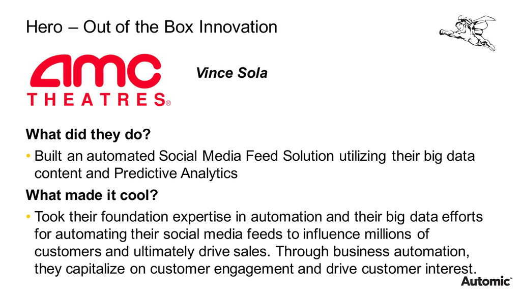 Feed Solution utilizing their big data content and Predictive Analytics What made it cool? • Took their foundation expertise in automation and their big data efforts for automating their social media feeds to influence millions of customers and ultimately drive sales. Through business automation, they capitalize on customer engagement and drive customer interest. Hero – Out of the Box Innovation Vince Sola