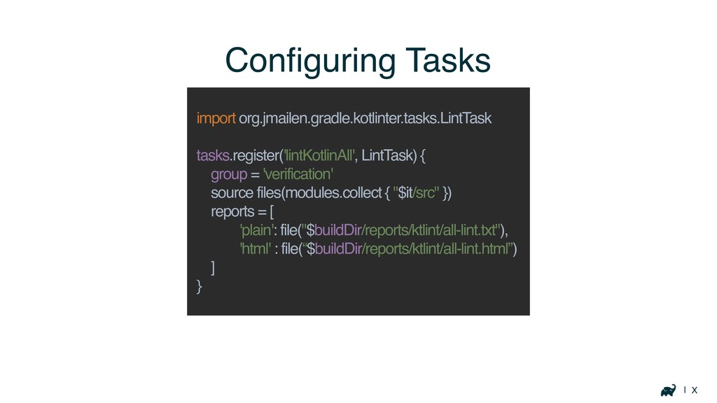 | X Configuring Tasks import org.jmailen.gradle.kotlinter.tasks.LintTask tasks.register('lintKotlinAll', LintTask) { group