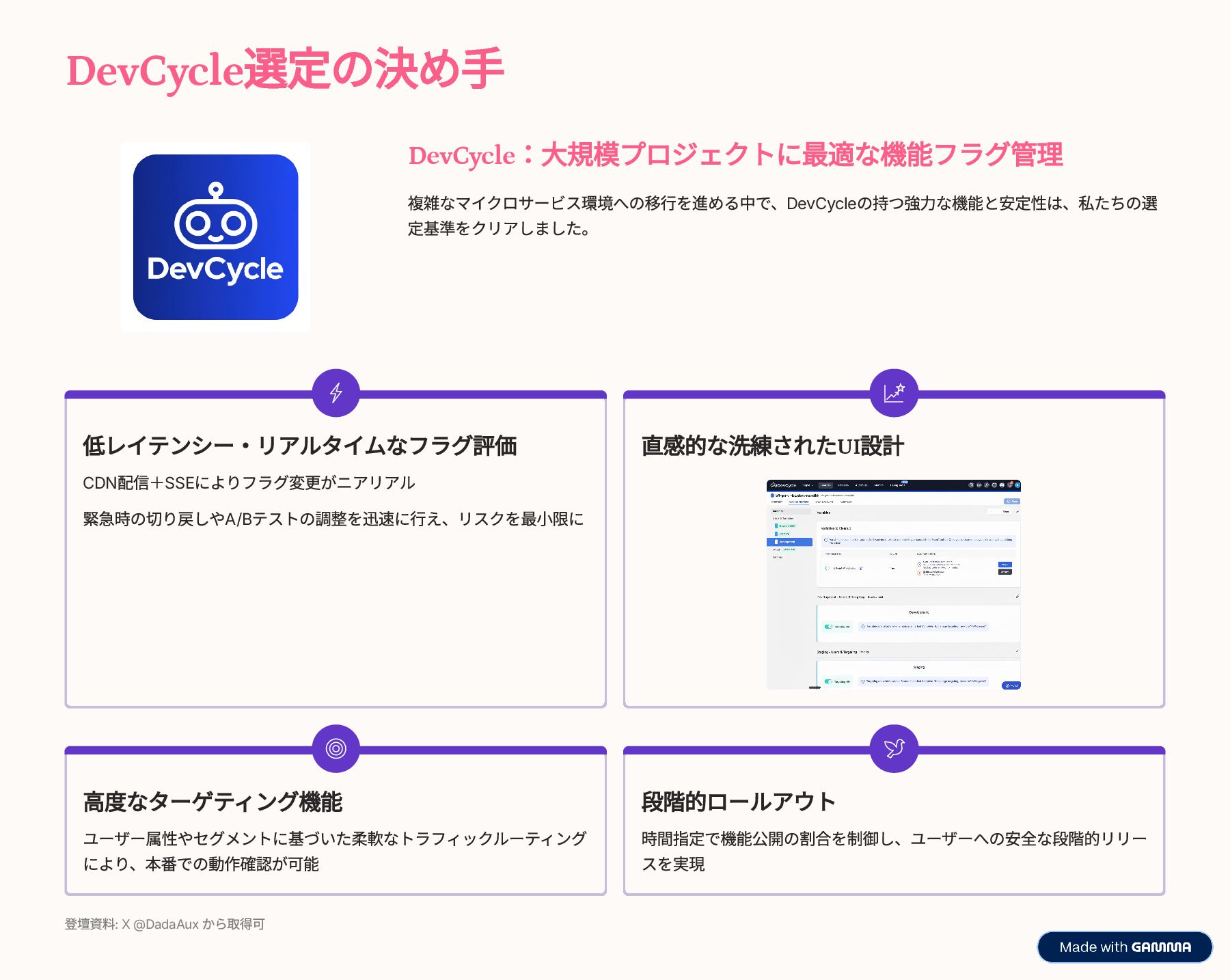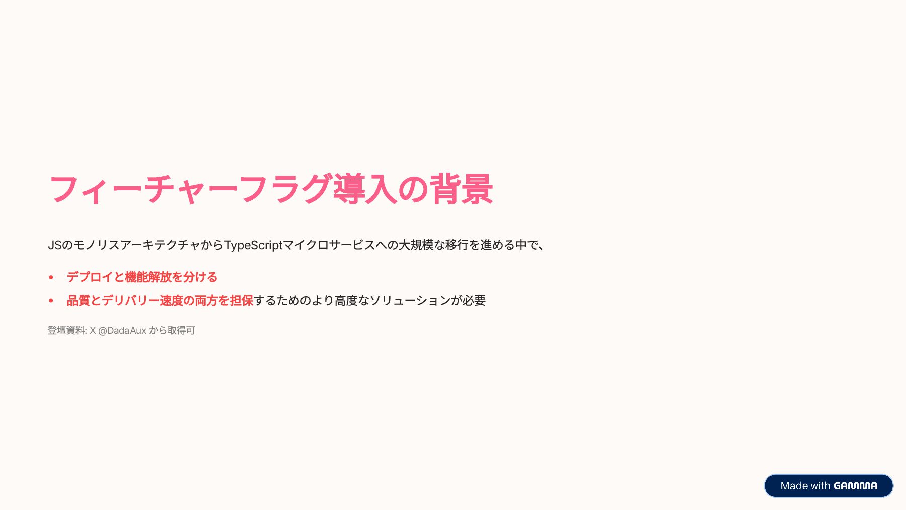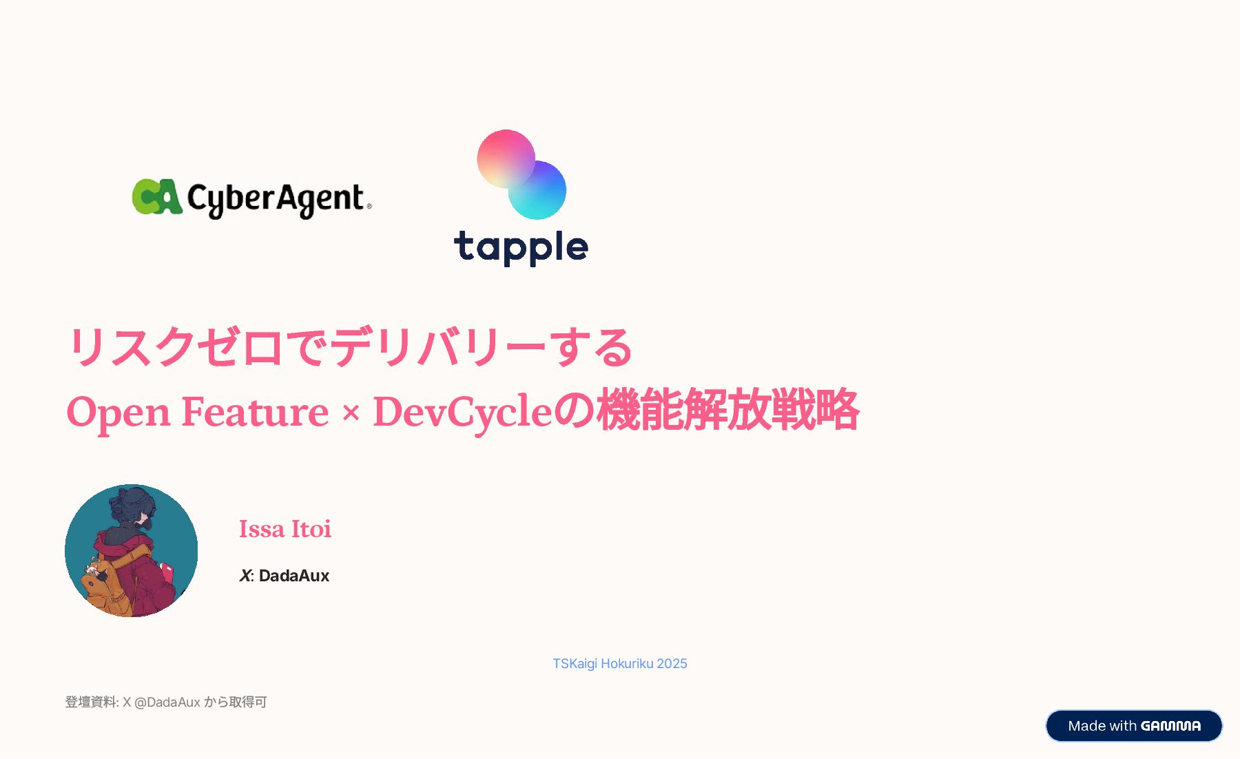 本LTでは、マッチングアプリ「tapple」の大規模なマイクロサービス移行において採用した、DevCycleの強力なリリース制御と、CNCF準拠のOpen FeatureによるTypeScript SDKを用いたコードの抽象化を組み合わせた機能解放戦略、そしてそれによって享受できた巨大なメリットの事例を紹介します。
