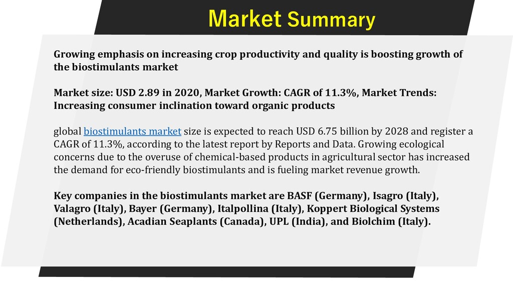 The global biostimulants market size was USD 2.89 billion in 2020 and is expected to register a CAGR of 11.3% during the forecast period. Key factors, such as increasing concerns about environmental impact of chemical products and rising need to develop and use eco-friendly products, are boosting global market revenue growth.