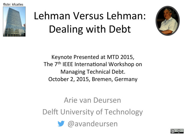 Deursen Del6 University of Technology @avandeursen 1 Keynote Presented at MTD 2015, The 7th IEEE InternaJonal Workshop on Managing Technical Debt. October 2, 2015, Bremen, Germany flickr: kfcatles