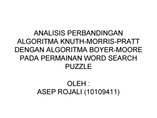 dalam puzzle yang tersusun secara random • Penelitian sebelumnya – Algoritma Knuth-Morris-Pratt (word search puzzle) – Perbandingan Algoritma Knuth-Morris-Pratt dan Algoritma Boyer-Moore