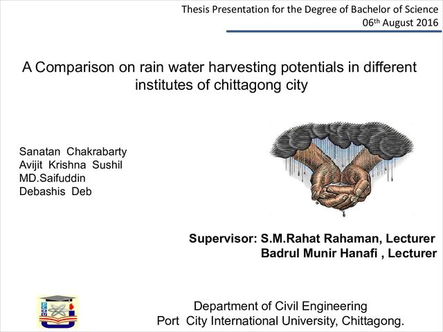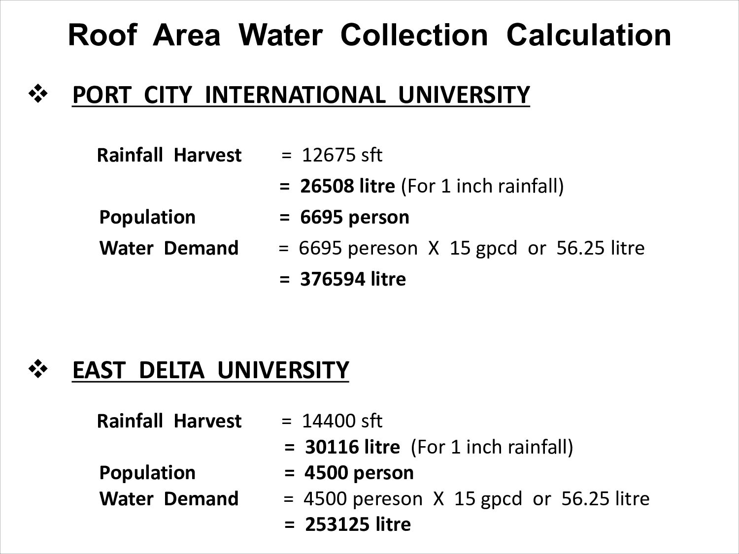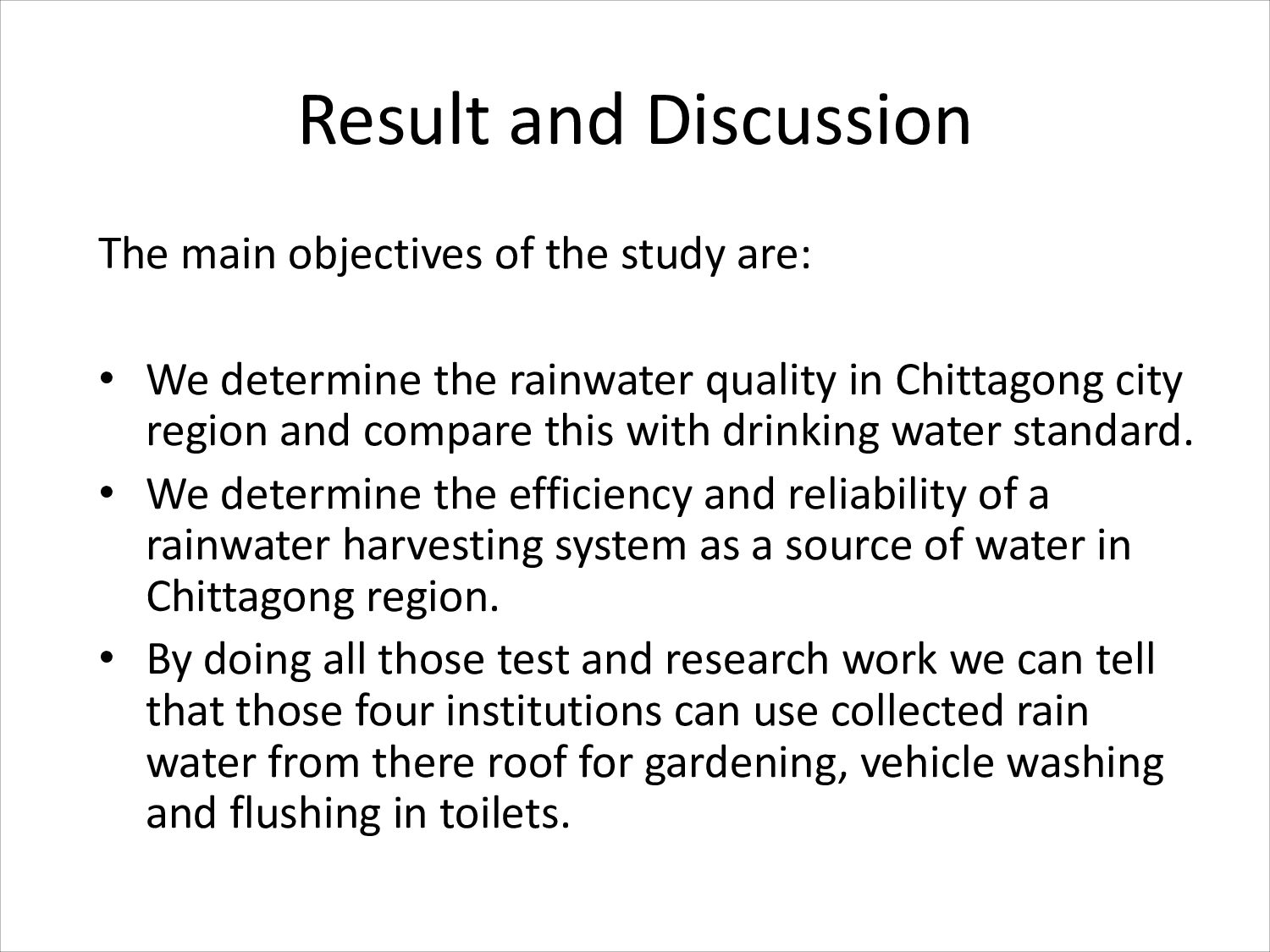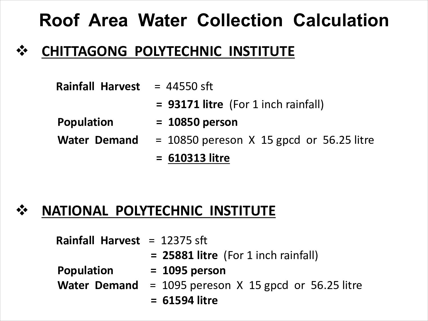 The objective of the research is to study the potential of the rainwater harvesting system of Chittagong city. The main emphasis is given on the rainwater harvesting as a source of drinking water and other domestic use. The research includes a literature review on rainfall data of Bangladesh to fulfill the water demand of different institutes of Chittagong. We surveyed four different institutions of Chittagong (i.e. Port City International University, East Delta University, Chittagong Polytechnic Institute, National Polytechnic College) and collected different in physical features, such as gross rooftop area, the total number of students and employees. Moreover, water samples were collected from rooftops from these institutions and tested according to the Bangladeshi regulation to analyze the quality of water. Finally, all aspects were analyzed to determine whether this could be a solution worth implementing in Chittagong to alleviate water scarcity problems as well as the possible positive impacts on the economy, society and the environment.