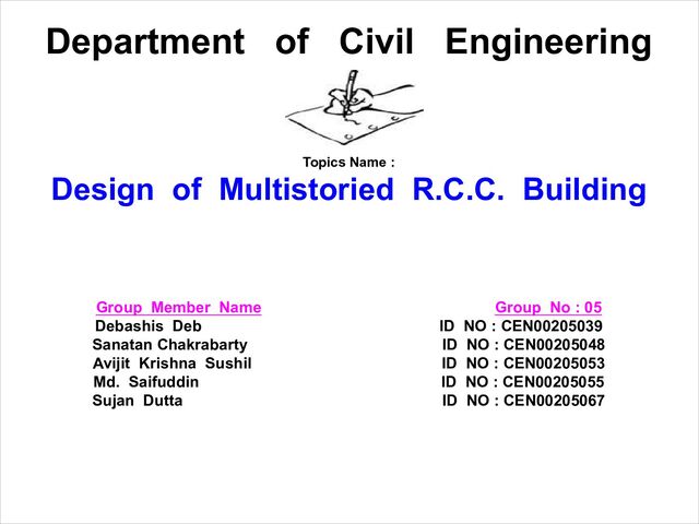Multistoried R.C.C. Building design analysis work in slab & beam & column layout plan with Slab design, slab load distribution plan, slab reinforcement details plan, Beam design, beam load distribution plan, beam reinforcement details plan, S.F.D. of beam diagram, B.M.D. of beam diagram, Column design, column load distribution plan, column reinforcement details plan, A.F.D. of column diagram, B.M.D. of column diagram, Live load and death load calculation, Wind load calculation diagram design, Earthquake load calculation diagram design, Foundation base column design, Stair design, Under ground water reservoir and Over head water reservoir and septic tank plan with reinforcement design plan details.