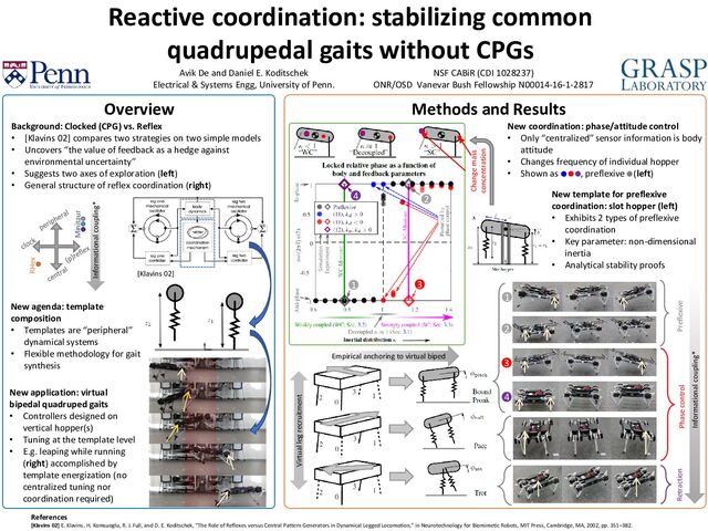(CDI 1028237) ONR/OSD Vanevar Bush Fellowship N00014-16-1-2817 Avik De and Daniel E. Koditschek Electrical & Systems Engg, University of Penn. Overview Methods and Results Retraction Preflexive Phase control Informational coupling* References [Klavins 02] E. Klavins, H. Komsuoglu, R. J. Full, and D. E. Koditschek, “The Role of Reflexes versus Central Pattern Generators in Dynamical Legged Locomotion,” in Neurotechnology for Biomimetic Robots, MIT Press, Cambridge, MA, 2002, pp. 351–382. [Klavins 02] Background: Clocked (CPG) vs. Reflex • [Klavins 02] compares two strategies on two simple models • Uncovers “the value of feedback as a hedge against environmental uncertainty” • Suggests two axes of exploration (left) • General structure of reflex coordination (right) Informational coupling* RHex Minitaur New agenda: template composition • Templates are “peripheral” dynamical systems • Flexible methodology for gait synthesis New application: virtual bipedal quadruped gaits • Controllers designed on vertical hopper(s) • Tuning at the template level • E.g. leaping while running (right) accomplished by template energization (no centralized tuning nor coordination required) Virtual leg recruitment New template for preflexive coordination: slot hopper (left) • Exhibits 2 types of preflexive coordination • Key parameter: non-dimensional inertia • Analytical stability proofs New coordination: phase/attitude control • Only “centralized” sensor information is body attitude • Changes frequency of individual hopper • Shown as , preflexive (left) Empirical anchoring to virtual biped 1 2 3 4 1 2 3 4 Simulation Experiment Change mass concentration