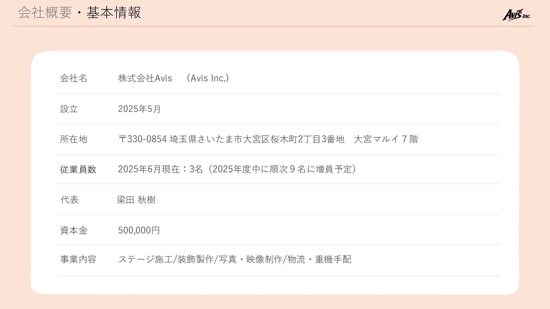 会社概要・基本情報 会社名 株式会社Avis (Avis Inc.) 設立 2025年5月 所在地 〒330-0854 埼玉県さいたま市大宮区桜木町2丁目3番地