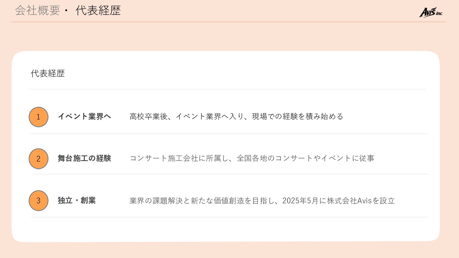 会社概要・ 代表経歴 代表経歴 1 2 3 イベント業界へ 高校卒業後、イベント業界へ入り、現場での経験を積み始める 舞台施工の経験 コンサート施工会社に所属し、全国各地のコンサートやイベントに従事