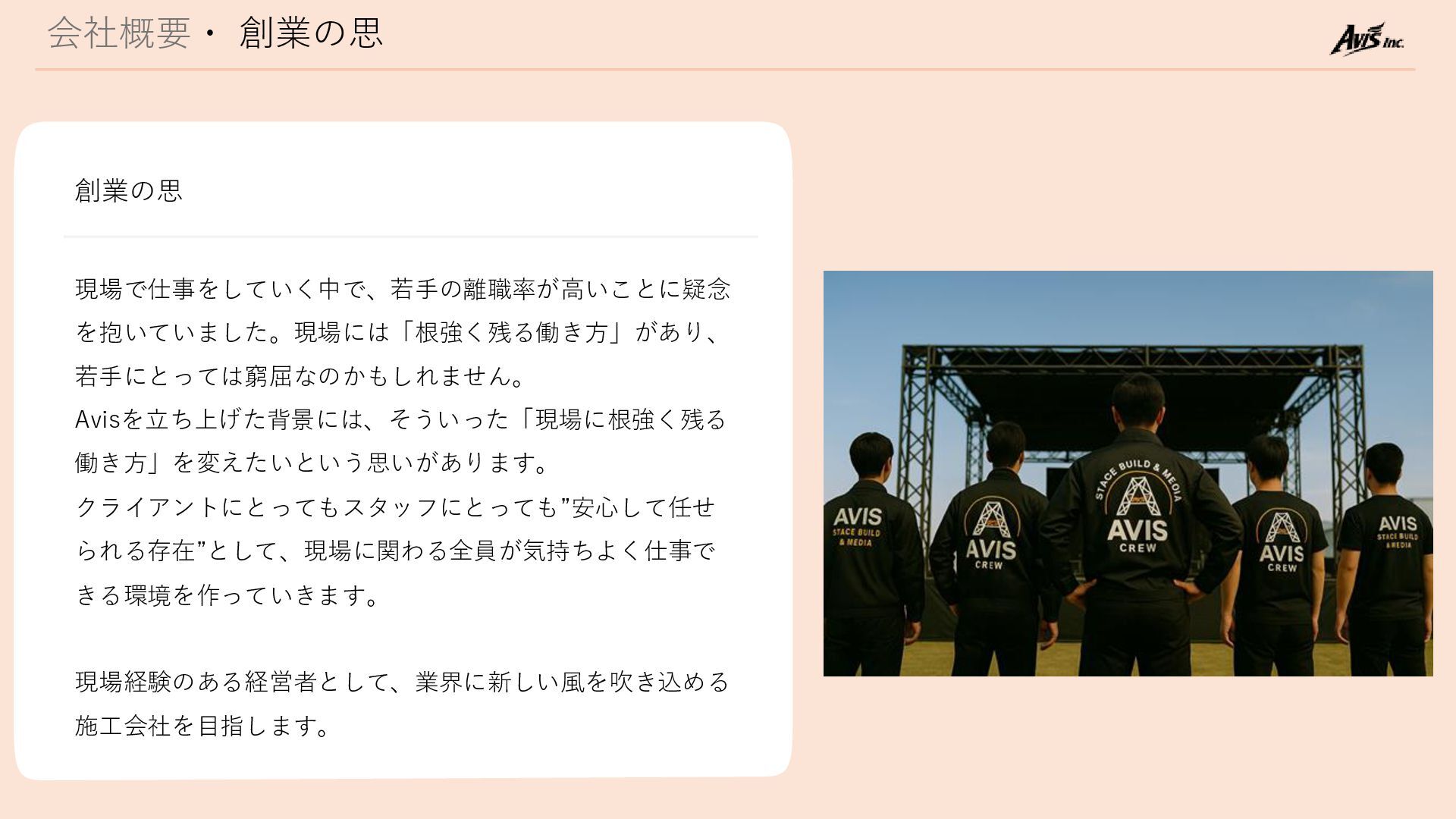 会社概要・ 創業の思 現場で仕事をしていく中で、若手の離職率が高いことに疑念 を抱いていました。現場には「根強く残る働き方」があり、 若手にとっては窮屈なのかもしれません。 Avisを立ち上げた背景には、そういった「現場に根強く残る 働き方」を変えたいという思いがあります。 クライアントにとってもスタッフにとっても”安心して任せ られる存在”として、現場に関わる全員が気持ちよく仕事で きる環境を作っていきます。