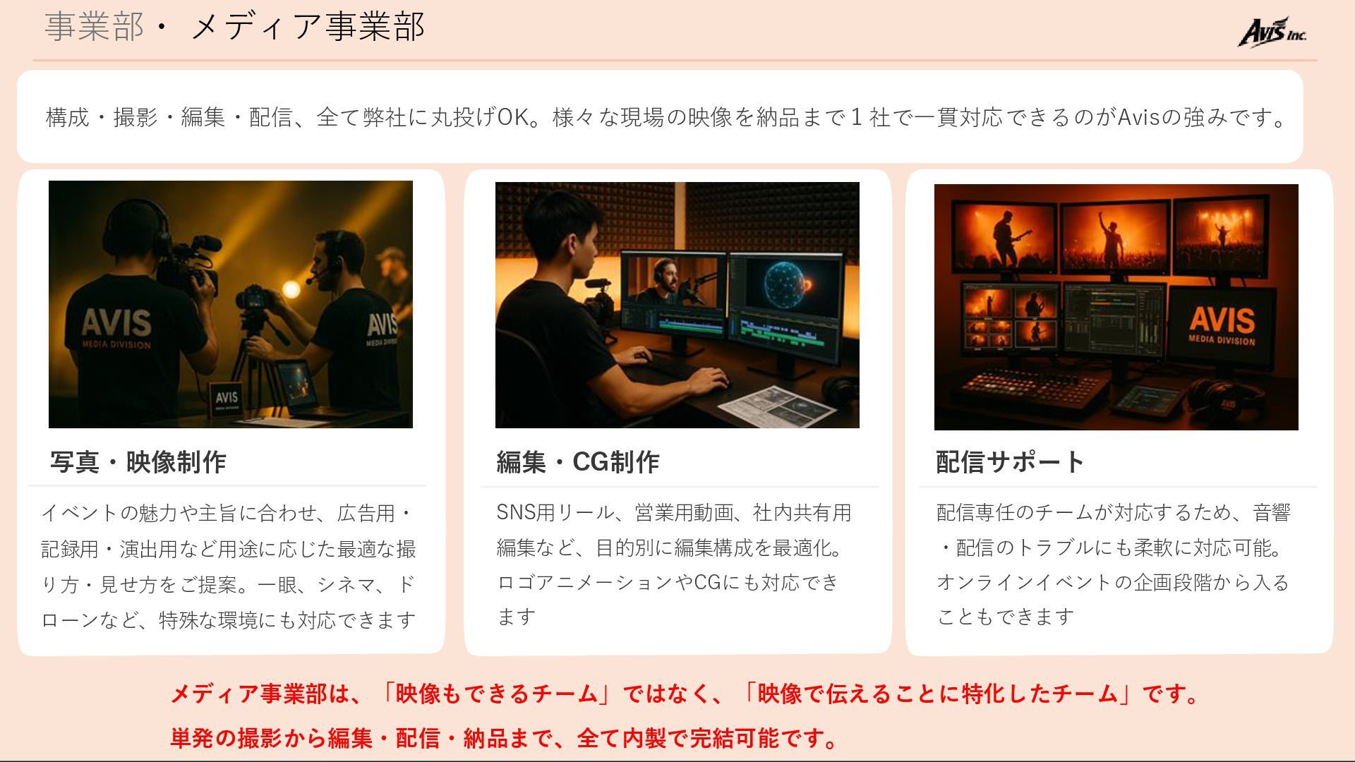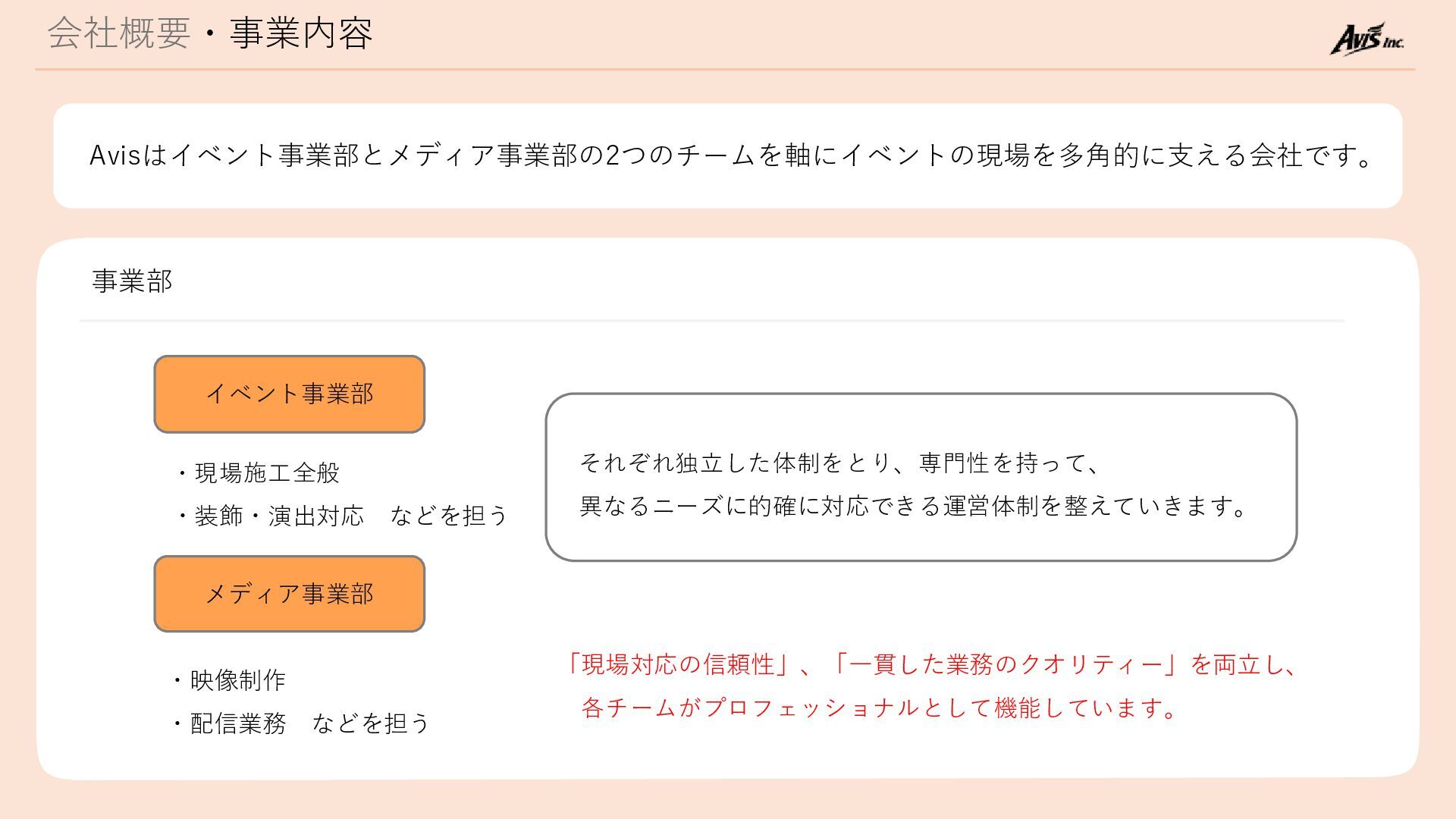 会社概要・事業内容 Avisはイベント事業部とメディア事業部の2つのチームを軸にイベントの現場を多角的に支える会社です。 イベント事業部 ・現場施工全般 ・装飾・演出対応 などを担う メディア事業部 ・映像制作 ・配信業務 などを担う