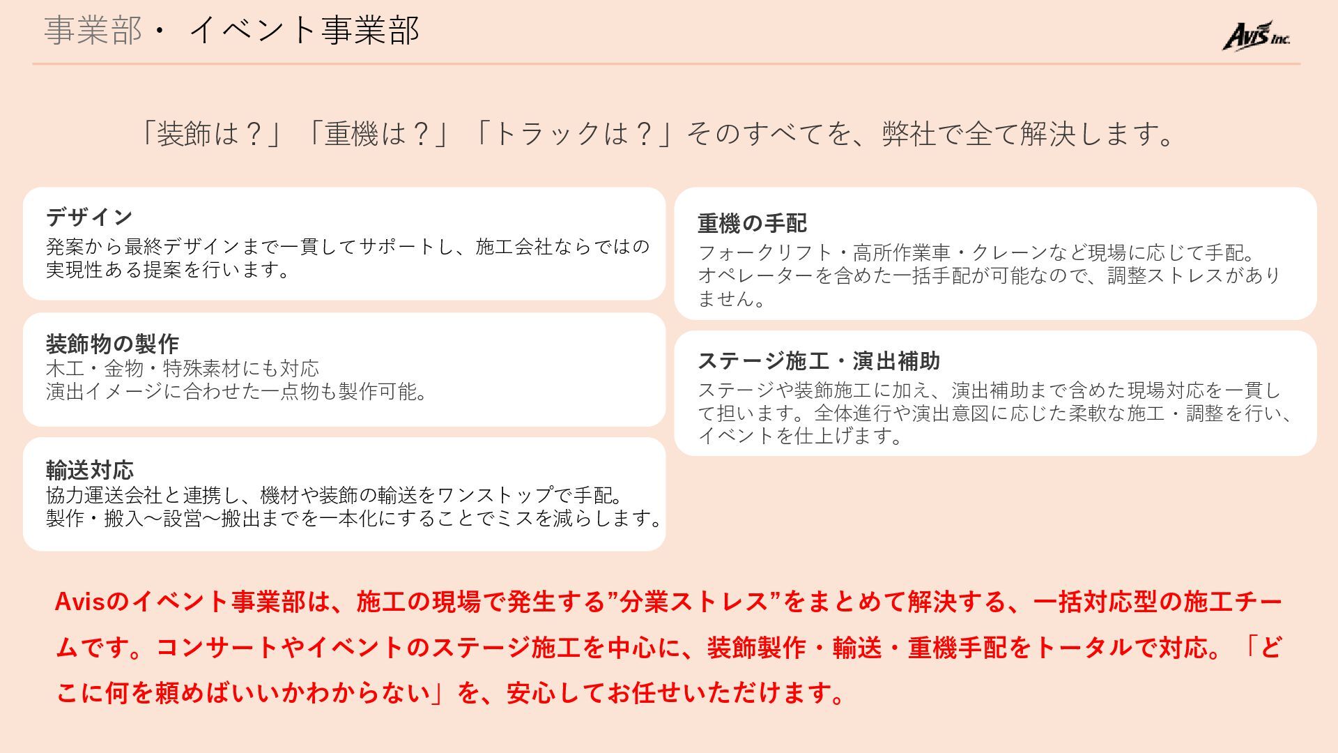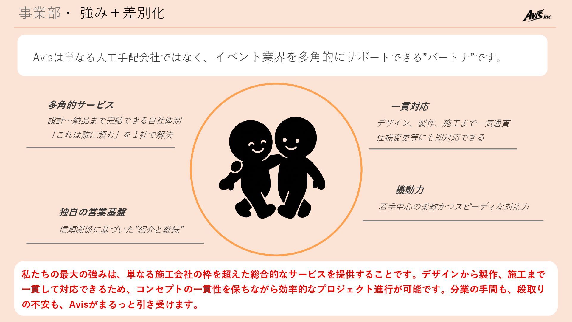 事業部・ 強み+差別化 Avisは単なる人工手配会社ではなく、イベント業界を多角的にサポートできる”パートナ”です。 多角的サービス 設計〜納品まで完結できる自社体制 「これは誰に頼む」を1社で解決 独自の営業基盤 信頼関係に基づいた”紹介と継続” 一貫対応 デザイン、製作、施工まで一気通貫
