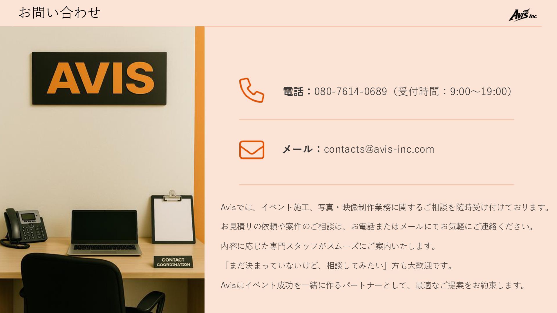 Avisでは、イベント施工、写真・映像制作業務に関するご相談を随時受け付けております。 お見積りの依頼や案件のご相談は、お電話またはメールにてお気軽にご連絡ください。 内容に応じた専門スタッフがスムーズにご案内いたします。 「まだ決まっていないけど、相談してみたい」方も大歓迎です。 Avisはイベント成功を一緒に作るパートナーとして、最適なご提案をお約束します。
