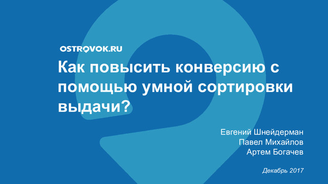 Проблема сортировки товаров в списке выдачи — это классическая задача современного интернет бизнеса. Мы, в Ostrovok.ru, тоже давно озаботились вопросом оптимизации выдачи и проделали много работы на этом пути. В нашем докладе мы расскажем про основные этапы в развитии логики сортировки отелей, опишем проблемы и ошибки, с которыми сталкивались, а также выводы, которые получилось сделать: