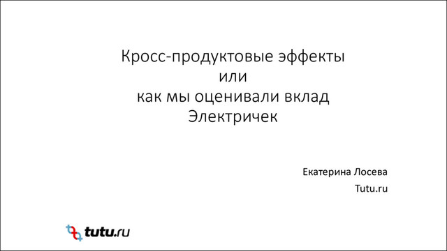 Многие компании предлагают рынку сразу несколько продуктов. Особое место занимает кейс, когда в портфеле есть продукт, не приносящий выручки напрямую. Как измерить его влияние на продажи? Какую пользу приносит компании существование данного продукта? В своём докладе аналитик Туту.ру Екатерина Лосева расскажет об эволюции подходов компании к расчету метрик кросс-продуктовых эффектов на примере раздела «Электрички».