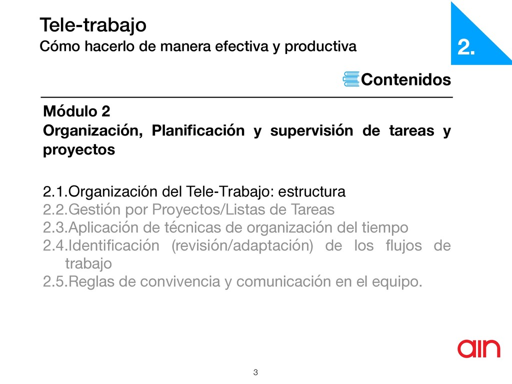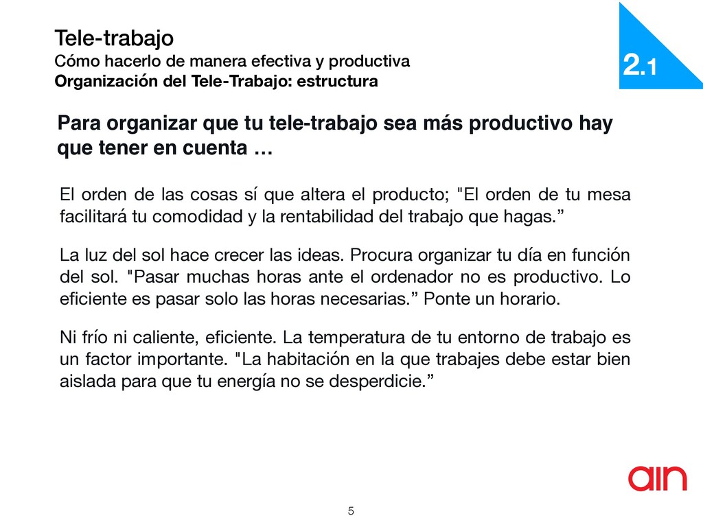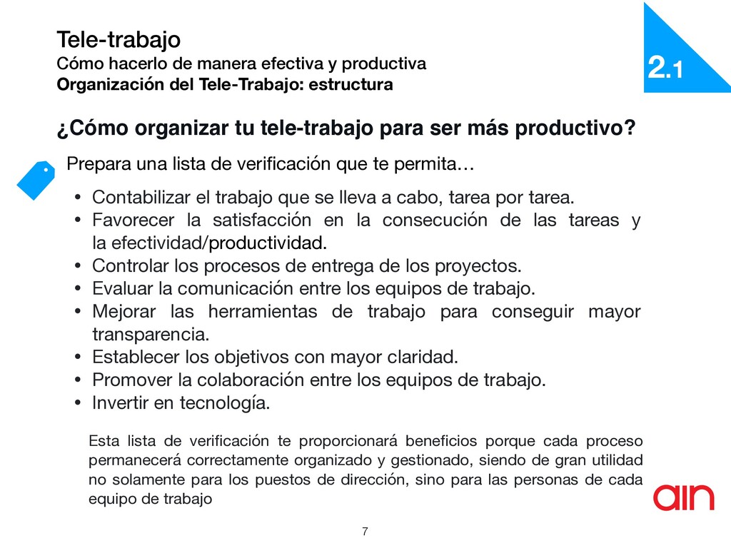 Tele-Trabajo: estructura 7 2.1 ¿Cómo organizar tu tele-trabajo para ser más productivo? Prepara una lista de verificación que te permita… • Contabilizar el trabajo que se lleva a cabo, tarea por tarea. • Favorecer la satisfacción en la consecución de las tareas y la efectividad/productividad. • Controlar los procesos de entrega de los proyectos. • Evaluar la comunicación entre los equipos de trabajo. • Mejorar las herramientas de trabajo para conseguir mayor transparencia. • Establecer los objetivos con mayor claridad. • Promover la colaboración entre los equipos de trabajo. • Invertir en tecnología. Esta lista de verificación te proporcionará beneficios porque cada proceso permanecerá correctamente organizado y gestionado, siendo de gran utilidad no solamente para los puestos de dirección, sino para las personas de cada equipo de trabajo