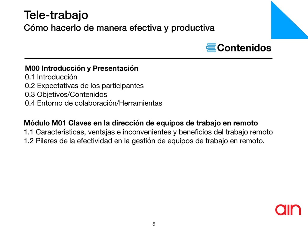 ¿Cuáles son los Objetivos de este programa? • Conocer las claves, ventajas, inconvenientes y beneficios de dirigir personas, equipos de manera remota (en un entorno disperso) • Aprender a dotar de flexibilidad, delegación, apoderamiento y confianza a los miembros del equipo. • Conocer entornos de colaboración y herramientas de tele-trabajo para ser efectivos; organización del tiempo de actividad y uso eficiente.