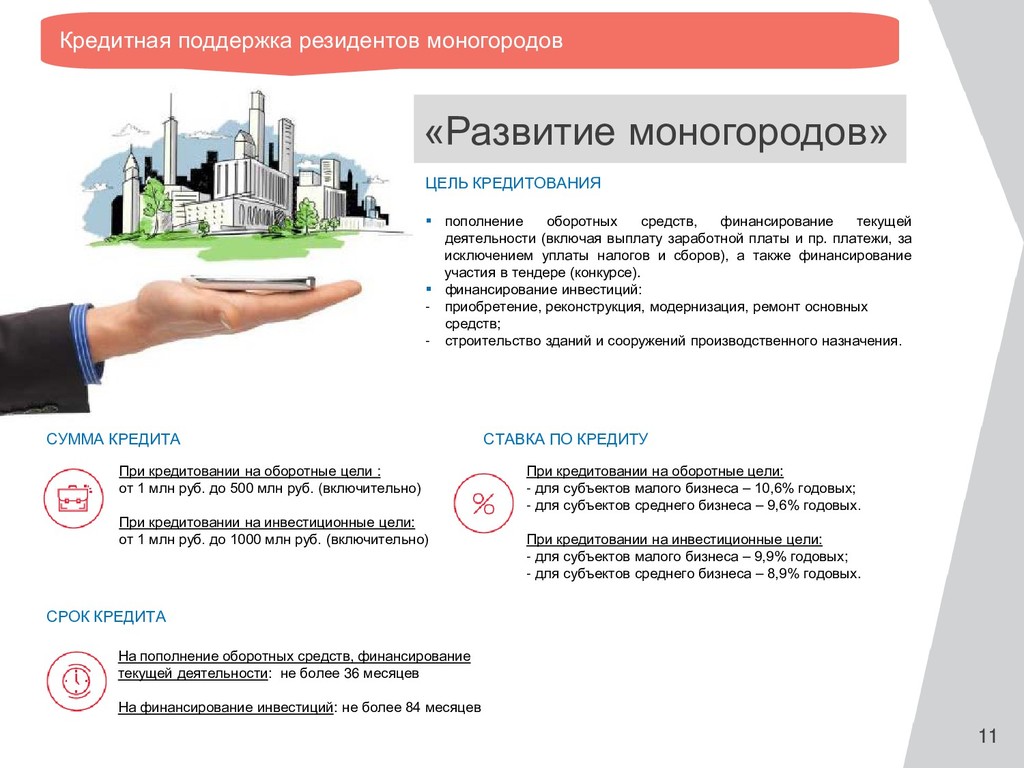 «Спорт закупка» (на цели исполнения контрактов в рамках Федерального закона 223- ФЗ) «Спорт комплекс» (прямое кредитование на цели реализации инвестиционных строительных проектов) Финансирование на цели, предусмотренные бизнес- планом, сформированным с помощью Портала Бизнес -навигатора МСП. Возможные бизнес-планы: магазин спорттоваров, фитнес-клуб, спортсекция для взрослых, тренажерный зал. СРОК СТАВКА Не более 7 лет 9,9% годовых Кредитная поддержка предпринимателей в сфере развития спорта СУММА Финансирование в рамках контрактного кредитования в рамках Федерального закона 223-ФЗ на цели поставки спорттоваров, а также ремонта спортивного оборудования. До 25 млн руб. До 3 лет, но не более срока действия контракта, увеличенного на 90 дней 9,6%/10,6% годовых ЦЕЛЬ ОБЕСПЕЧЕНИЕ Согарантия КМСП в размере до 75% от суммы кредита Финансирование инвестиций в области создания многофункциональных спортивных центров. От 1 млн. руб до 500 млн руб. От 1 млн. руб до 1000 млн руб. Не более 10 лет 8,9%/9,9% годовых Согарантия КМСП в размере до 75% от суммы кредита Согарантия КМСП в размере до 75% от суммы кредита