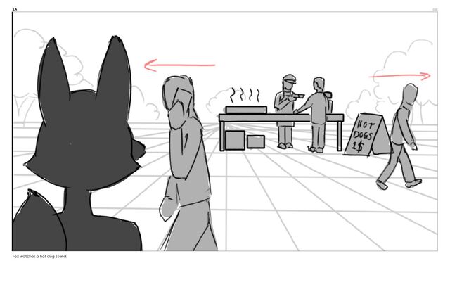 2B 0:04 Fox approaches the hot dog stand.