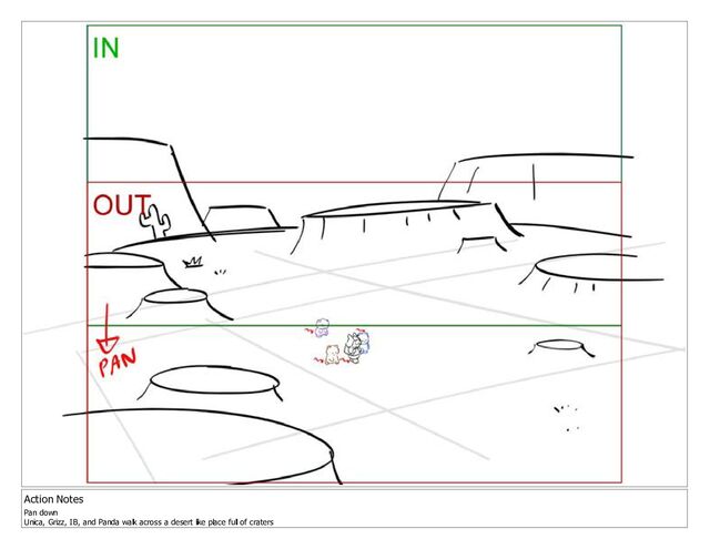Notes Panda is desperate to get to the worm hive and ferally scuttles/swims/slides past Grizz and IB at extremely fast speed, spinning his arms like a cartwheel at very fast speed (freestyle swimming motion but more exaggerated)