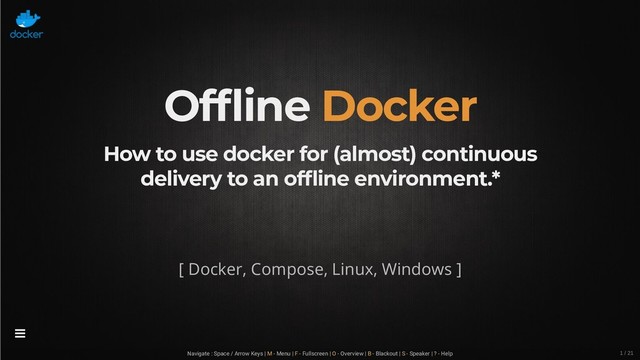 delivery to an of ine environment.* [ Docker, Compose, Linux, Windows ] Navigate : Space / Arrow Keys | - Menu | - Fullscreen | - Overview | - Blackout | - Speaker | - Help M F O B S ? 1 / 21