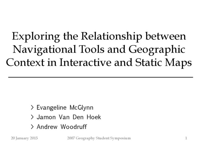 with real-world navigation tasks on the ground ! • Test subjects with more complex, realistic map ! • Test different geographic scales ! • Test specific interactive map navigation tools in isolation ! • If knowledge of geographic context is indeed less with interactive maps, what interface elements or tools can improve this knowledge? 20 January 2015
