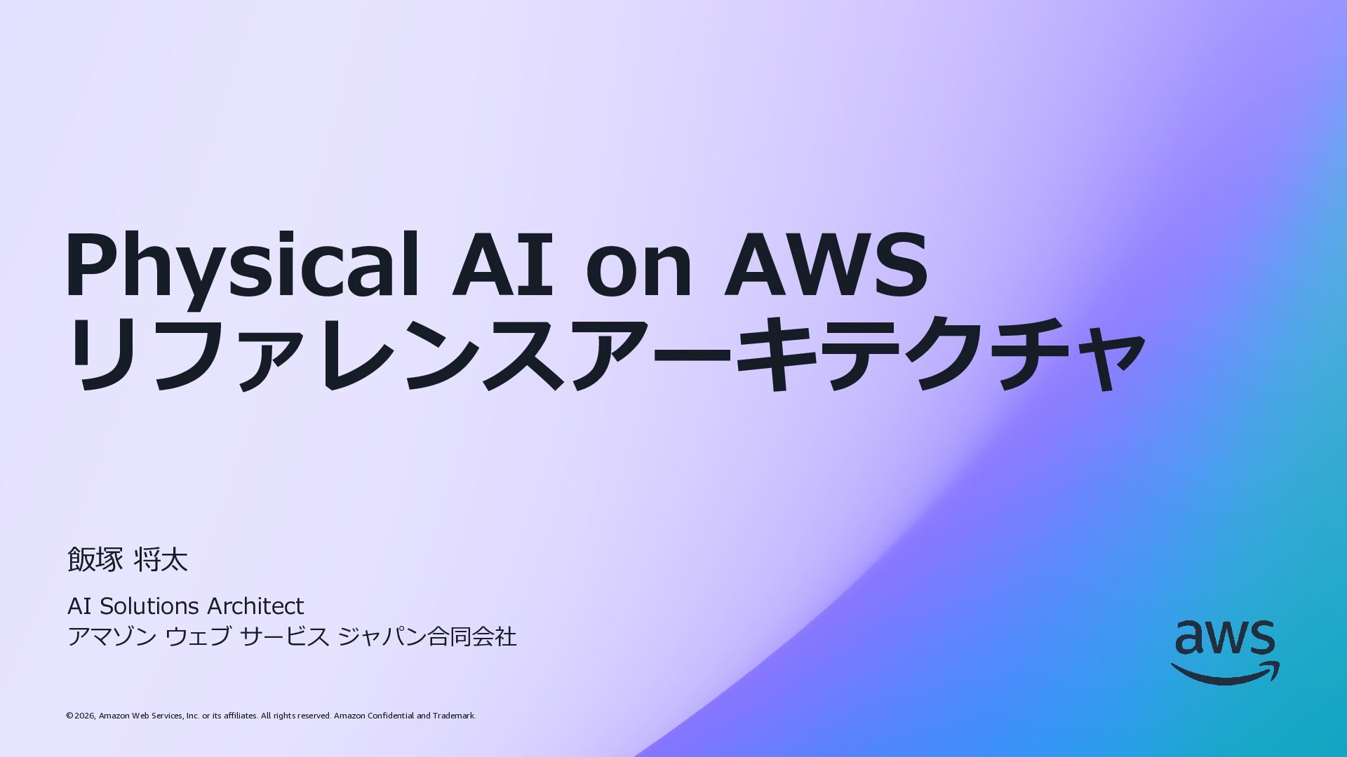 rights reserved. Amazon Confidential and Trademark. © 2026, Amazon Web Services, Inc. or its affiliates. All rights reserved. Amazon Confidential and Trademark. Physical AI on AWS リファレンスアーキテクチャ 飯塚 将太 AI Solutions Architect アマゾン ウェブ サービス ジャパン合同会社
