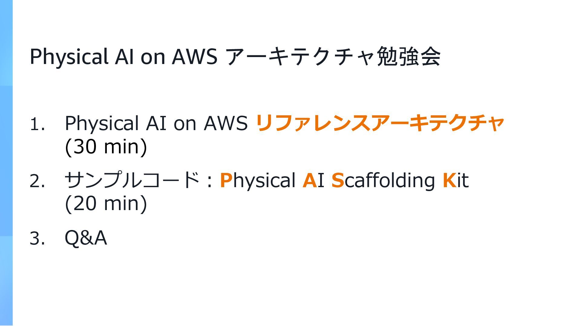 rights reserved. Amazon Confidential and Trademark. Physical AI on AWS アーキテクチャ勉強会 1. Physical AI on AWS リファレンスアーキテクチャ (30 min) 2. サンプルコード︓Physical AI Scaffolding Kit (20 min) 3. Q&A