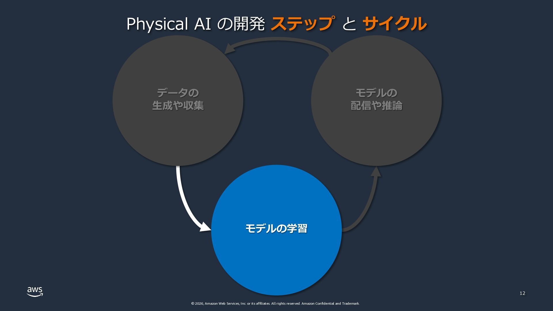 rights reserved. Amazon Confidential and Trademark. 12 Physical AI の開発 ステップ と サイクル データの ⽣成や収集 モデルの学習 モデルの 配信や推論