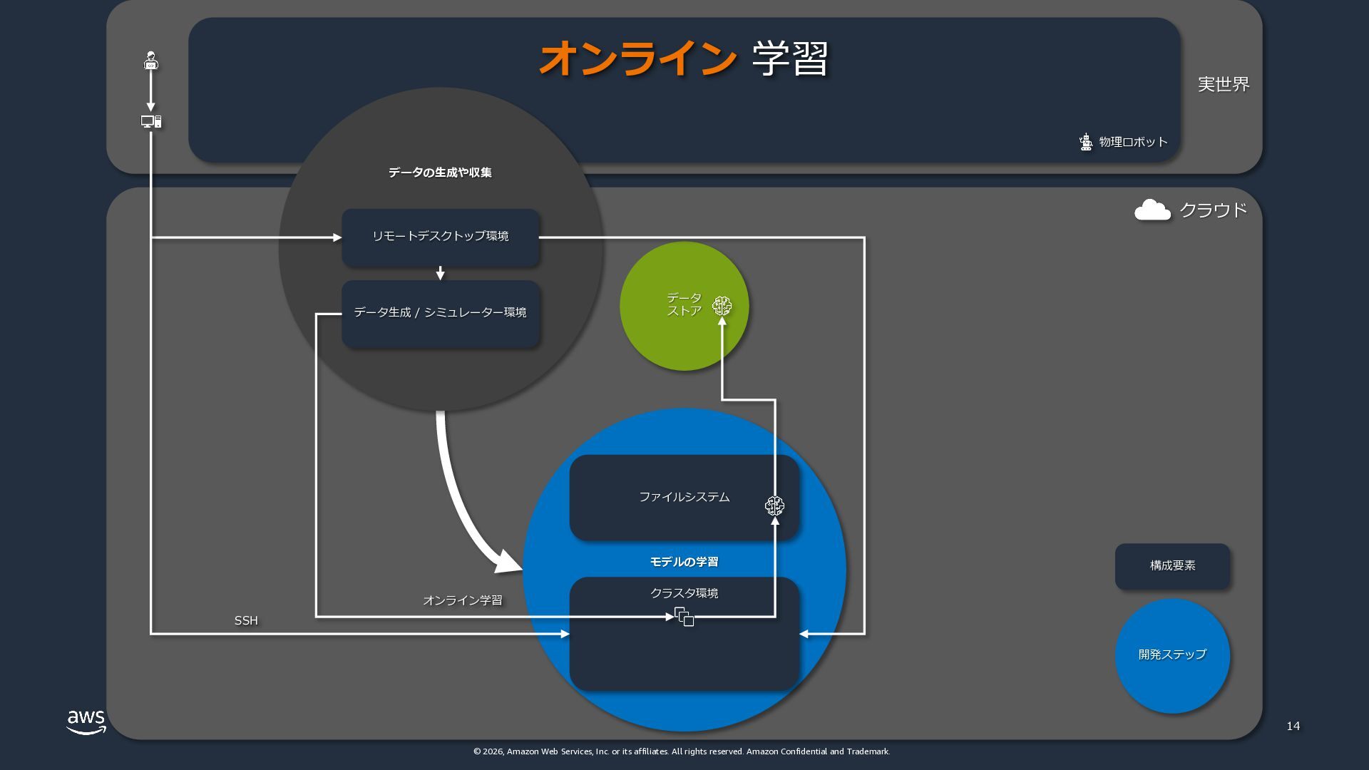 rights reserved. Amazon Confidential and Trademark. クラウド 実世界 物理ロボット データの⽣成や収集 モデルの学習 ファイルシステム クラスタ環境 13 データ ストア リモートデスクトップ環境 データ⽣成 / シミュレーター環境 オフライン 学習 オフライン学習 SSH 構成要素 開発ステップ