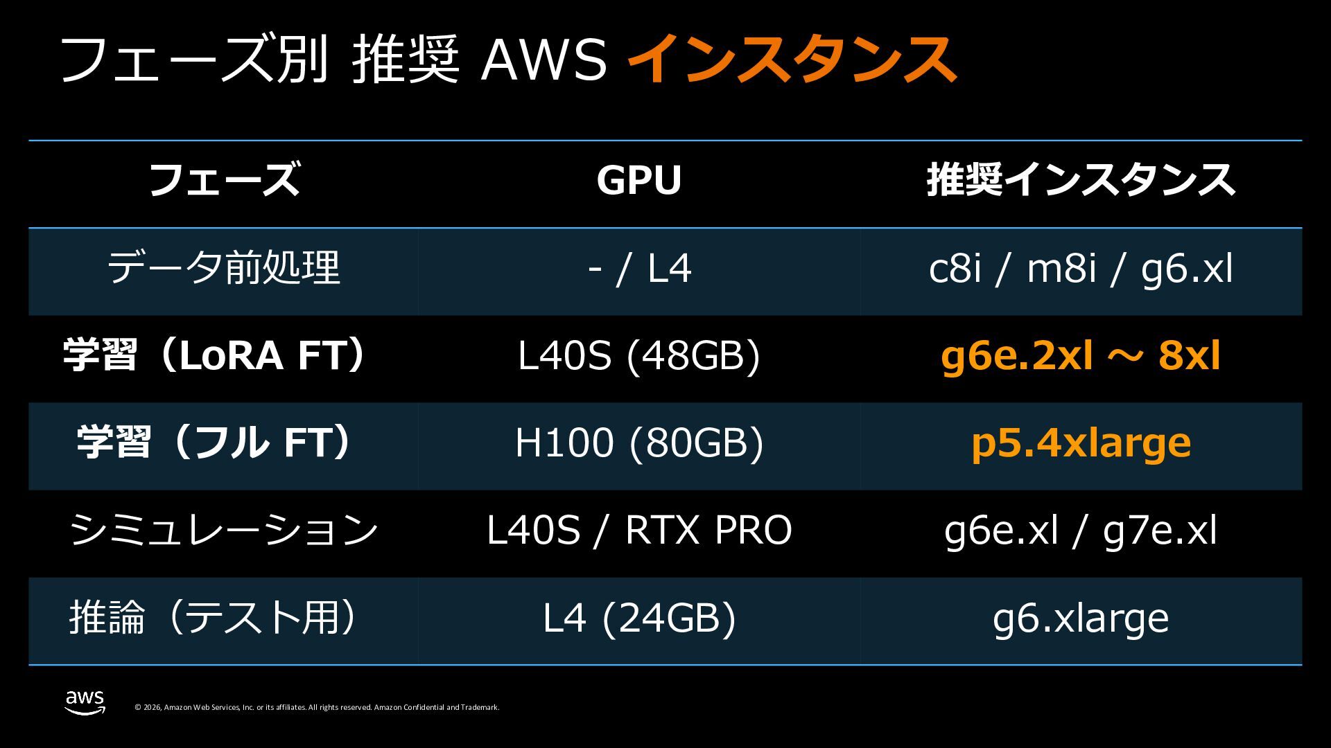 rights reserved. Amazon Confidential and Trademark. フェーズ別 推奨 AWS インスタンス フェーズ GPU 推奨インスタンス データ前処理 - / L4 c8i / m8i / g6.xl 学習(LoRA FT) L40S (48GB) g6e.2xl 〜 8xl 学習(フル FT) H100 (80GB) p5.4xlarge シミュレーション L40S / RTX PRO g6e.xl / g7e.xl 推論(テスト⽤) L4 (24GB) g6.xlarge