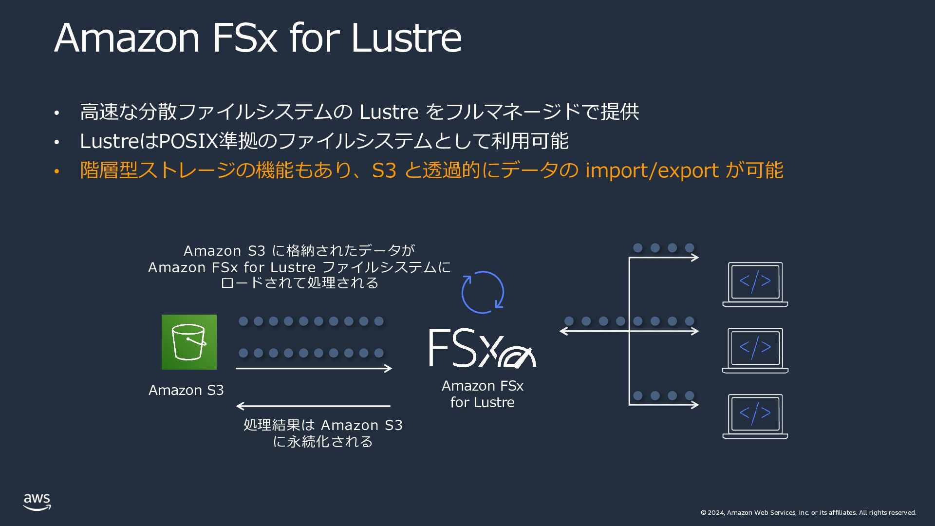 rights reserved. Amazon FSx for Lustre • ⾼速な分散ファイルシステムの Lustre をフルマネージドで提供 • LustreはPOSIX準拠のファイルシステムとして利⽤可能 • 階層型ストレージの機能もあり、S3 と透過的にデータの import/export が可能 Amazon S3 に格納されたデータが Amazon FSx for Lustre ファイルシステムに ロードされて処理される 処理結果は Amazon S3 に永続化される Amazon FSx for Lustre Amazon S3