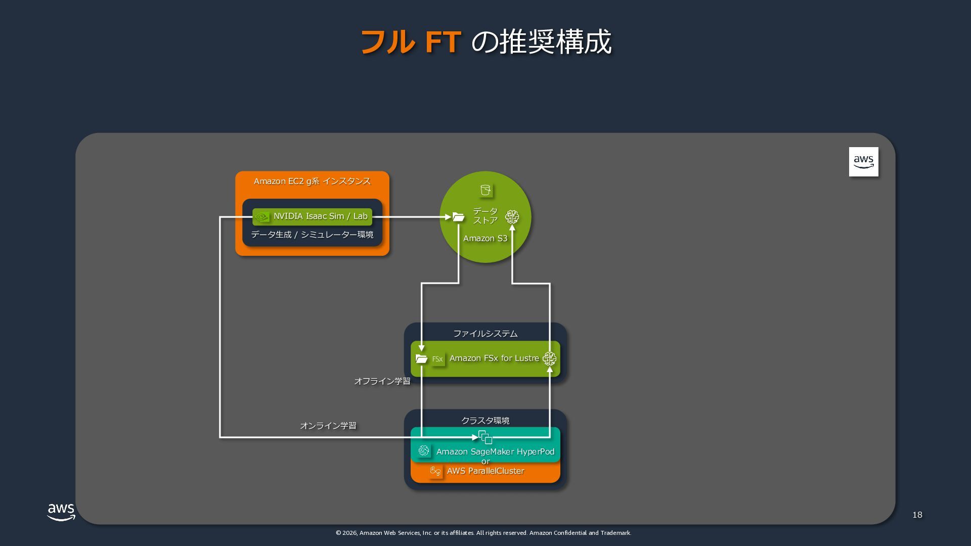 rights reserved. Amazon Confidential and Trademark. Amazon EC2 g系 インスタンス ファイルシステム クラスタ環境 AWS ParallelCluster 18 データ ストア Amazon S3 Amazon FSx for Lustre Amazon SageMaker HyperPod or データ⽣成 / シミュレーター環境 フル FT の推奨構成 NVIDIA Isaac Sim / Lab オフライン学習 オンライン学習