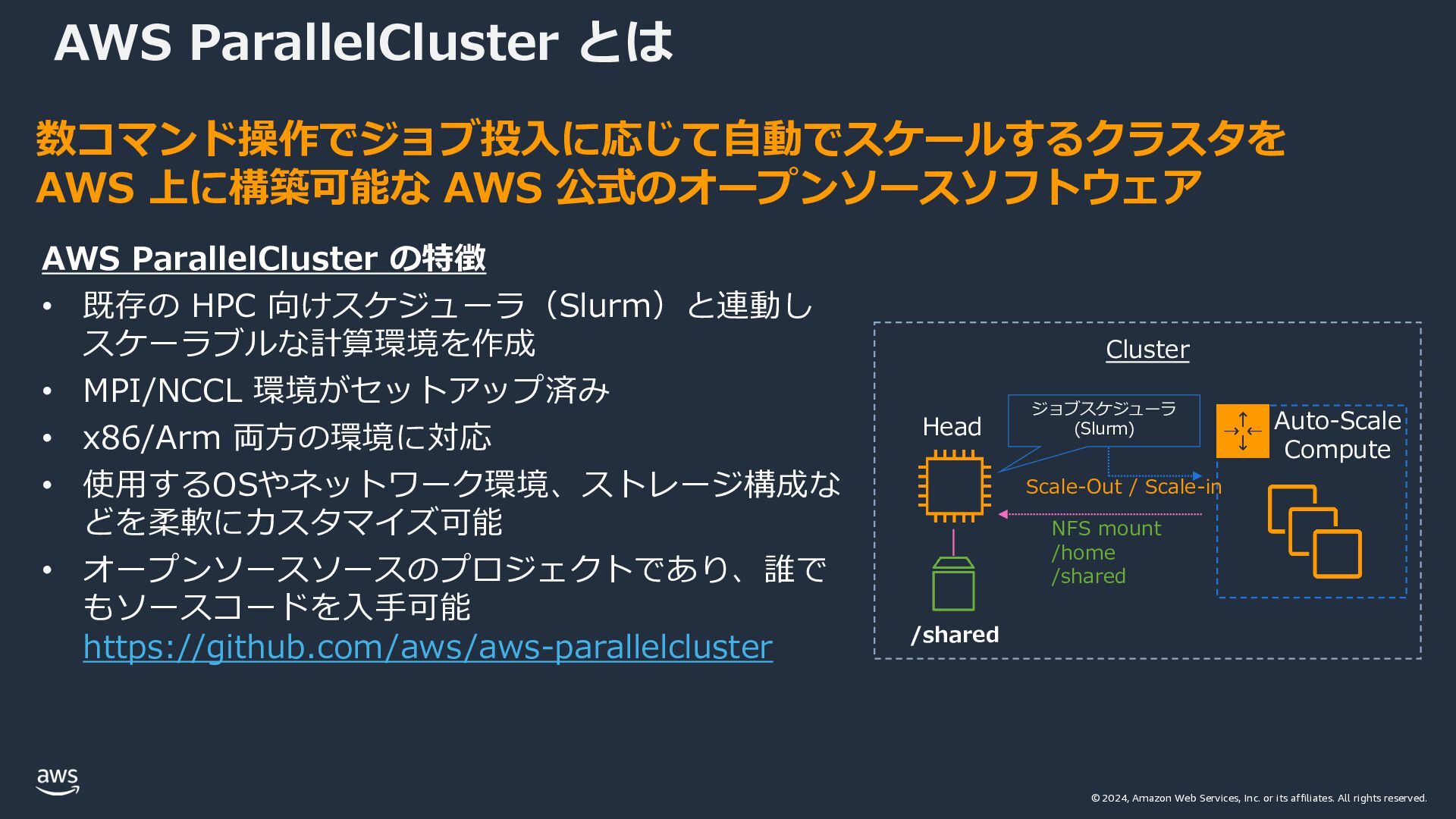 rights reserved. 数コマンド操作でジョブ投⼊に応じて⾃動でスケールするクラスタを AWS 上に構築可能な AWS 公式のオープンソースソフトウェア AWS ParallelCluster の特徴 • 既存の HPC 向けスケジューラ(Slurm)と連動し スケーラブルな計算環境を作成 • MPI/NCCL 環境がセットアップ済み • x86/Arm 両⽅の環境に対応 • 使⽤するOSやネットワーク環境、ストレージ構成な どを柔軟にカスタマイズ可能 • オープンソースソースのプロジェクトであり、誰で もソースコードを⼊⼿可能 https://github.com/aws/aws-parallelcluster AWS ParallelCluster とは Cluster Head Auto-Scale Compute Scale-Out / Scale-in ジョブスケジューラ (Slurm) /shared NFS mount /home /shared