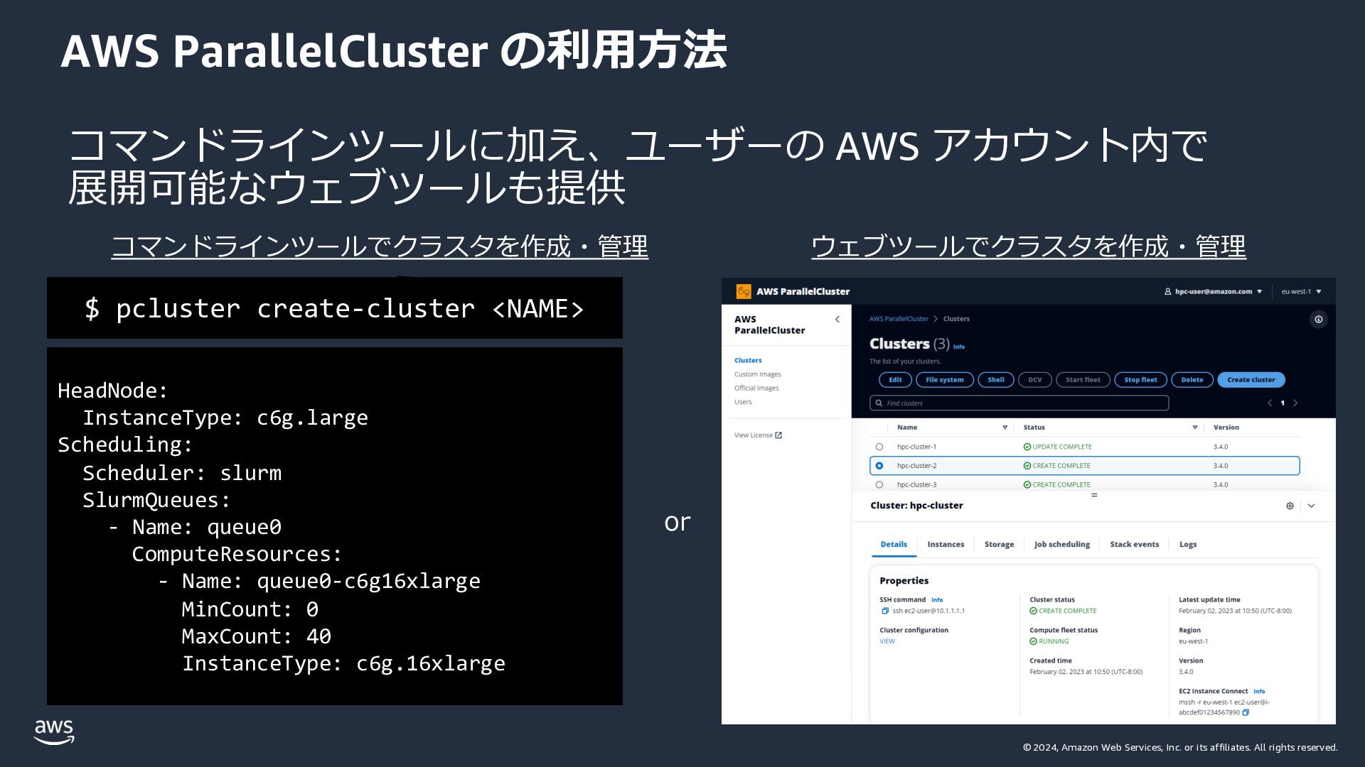 rights reserved. AWS ParallelCluster の利⽤⽅法 コマンドラインツールに加え、ユーザーの AWS アカウント内で 展開可能なウェブツールも提供 HeadNode: InstanceType: c6g.large Scheduling: Scheduler: slurm SlurmQueues: - Name: queue0 ComputeResources: - Name: queue0-c6g16xlarge MinCount: 0 MaxCount: 40 InstanceType: c6g.16xlarge コマンドラインツールでクラスタを作成・管理 $ pcluster create-cluster <NAME> ウェブツールでクラスタを作成・管理 or