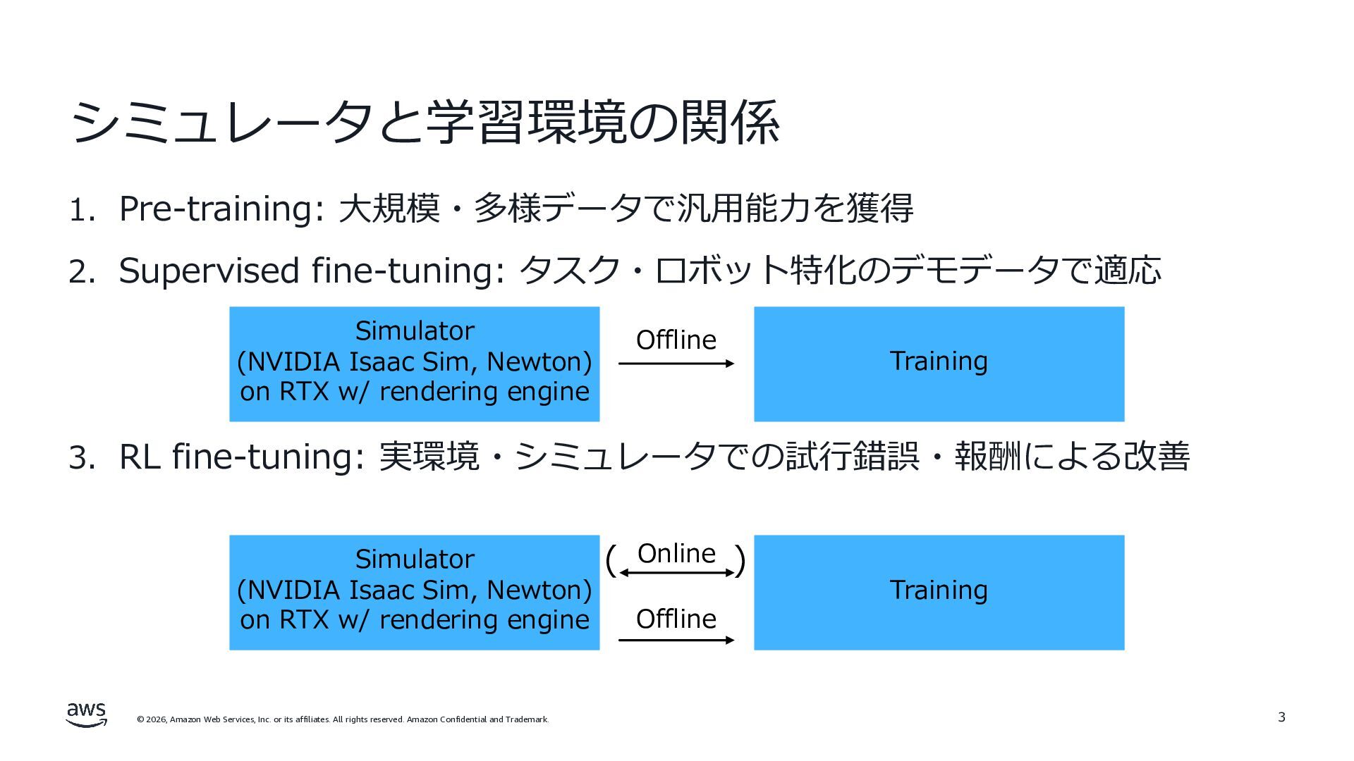 rights reserved. Amazon Confidential and Trademark. シミュレータと学習環境の関係 1. Pre-training: ⼤規模・多様データで汎⽤能⼒を獲得 2. Supervised fine-tuning: タスク・ロボット特化のデモデータで適応 3. RL fine-tuning: 実環境・シミュレータでの試⾏錯誤・報酬による改善 3 Simulator (NVIDIA Isaac Sim, Newton) on RTX w/ rendering engine Training Simulator (NVIDIA Isaac Sim, Newton) on RTX w/ rendering engine Training Offline Offline Online ( )