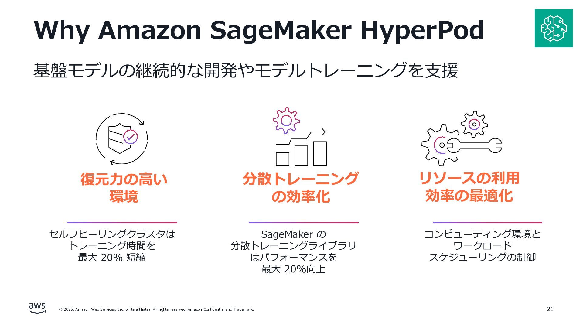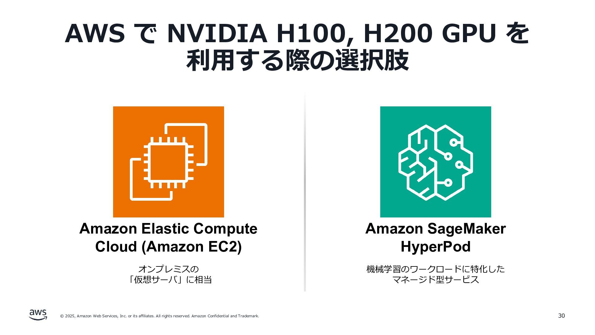 rights reserved. Amazon Confidential and Trademark. AWS で NVIDIA H100, H200 GPU を 利⽤する際の選択肢 30 Amazon Elastic Compute Cloud (Amazon EC2) オンプレミスの 「仮想サーバ」に相当 Amazon SageMaker HyperPod 機械学習のワークロードに特化した マネージド型サービス