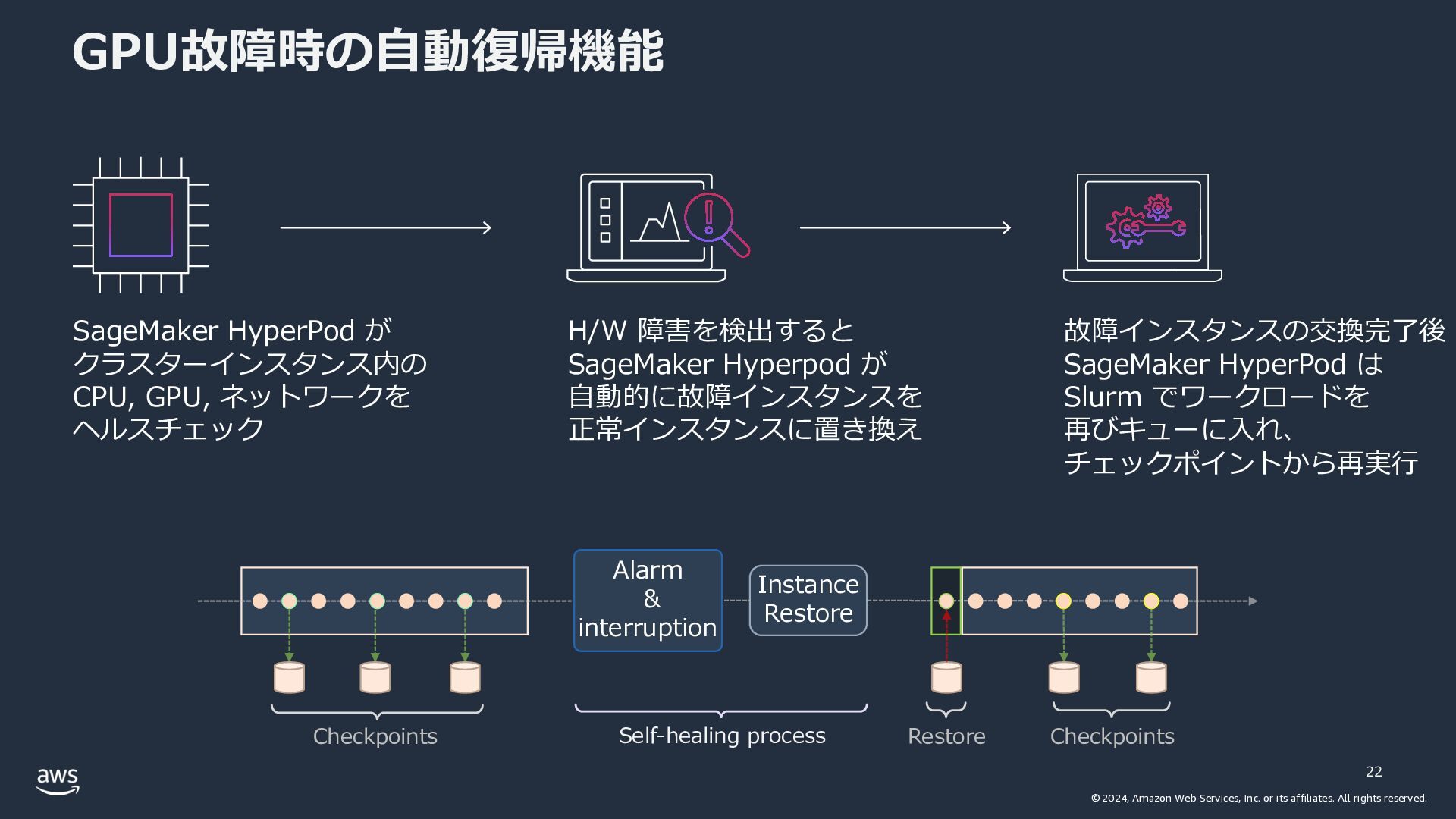 rights reserved. GPU故障時の⾃動復帰機能 22 SageMaker HyperPod が クラスターインスタンス内の CPU, GPU, ネットワークを ヘルスチェック H/W 障害を検出すると SageMaker Hyperpod が ⾃動的に故障インスタンスを 正常インスタンスに置き換え 故障インスタンスの交換完了後 SageMaker HyperPod は Slurm でワークロードを 再びキューに⼊れ、 チェックポイントから再実⾏ Checkpoints Restore Checkpoints Alarm & interruption Instance Restore Self-healing process
