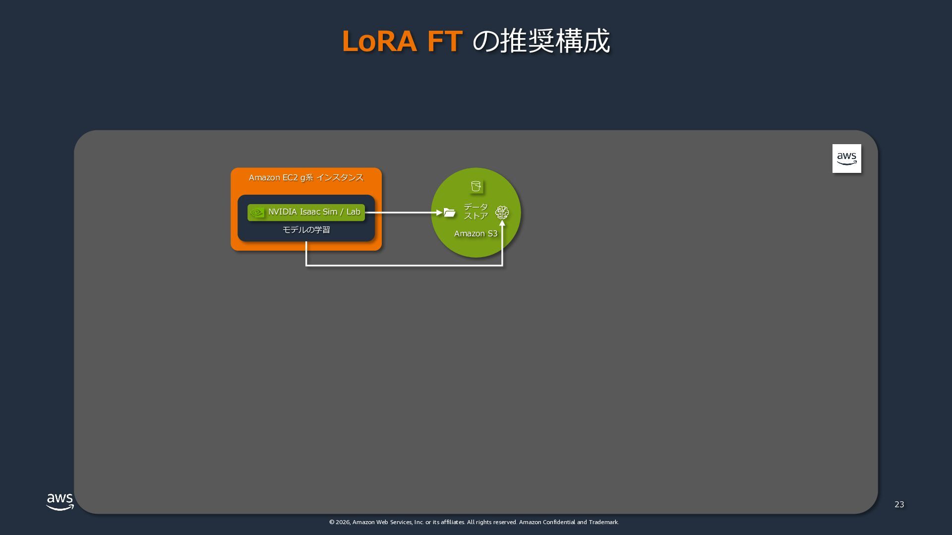 rights reserved. Amazon Confidential and Trademark. Amazon EC2 g系 インスタンス 23 データ ストア Amazon S3 モデルの学習 LoRA FT の推奨構成 NVIDIA Isaac Sim / Lab