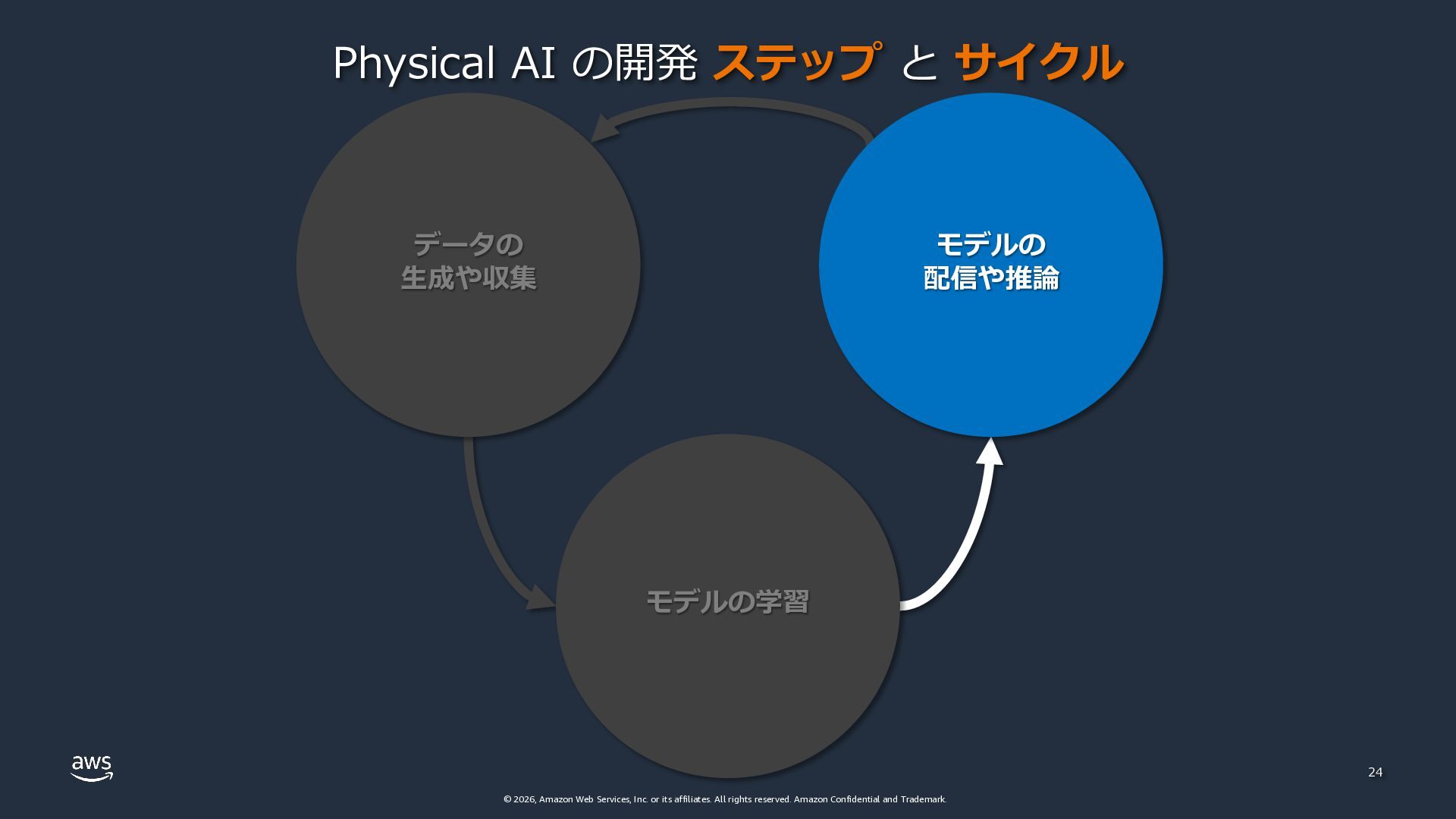 rights reserved. Amazon Confidential and Trademark. 24 Physical AI の開発 ステップ と サイクル データの ⽣成や収集 モデルの学習 モデルの 配信や推論
