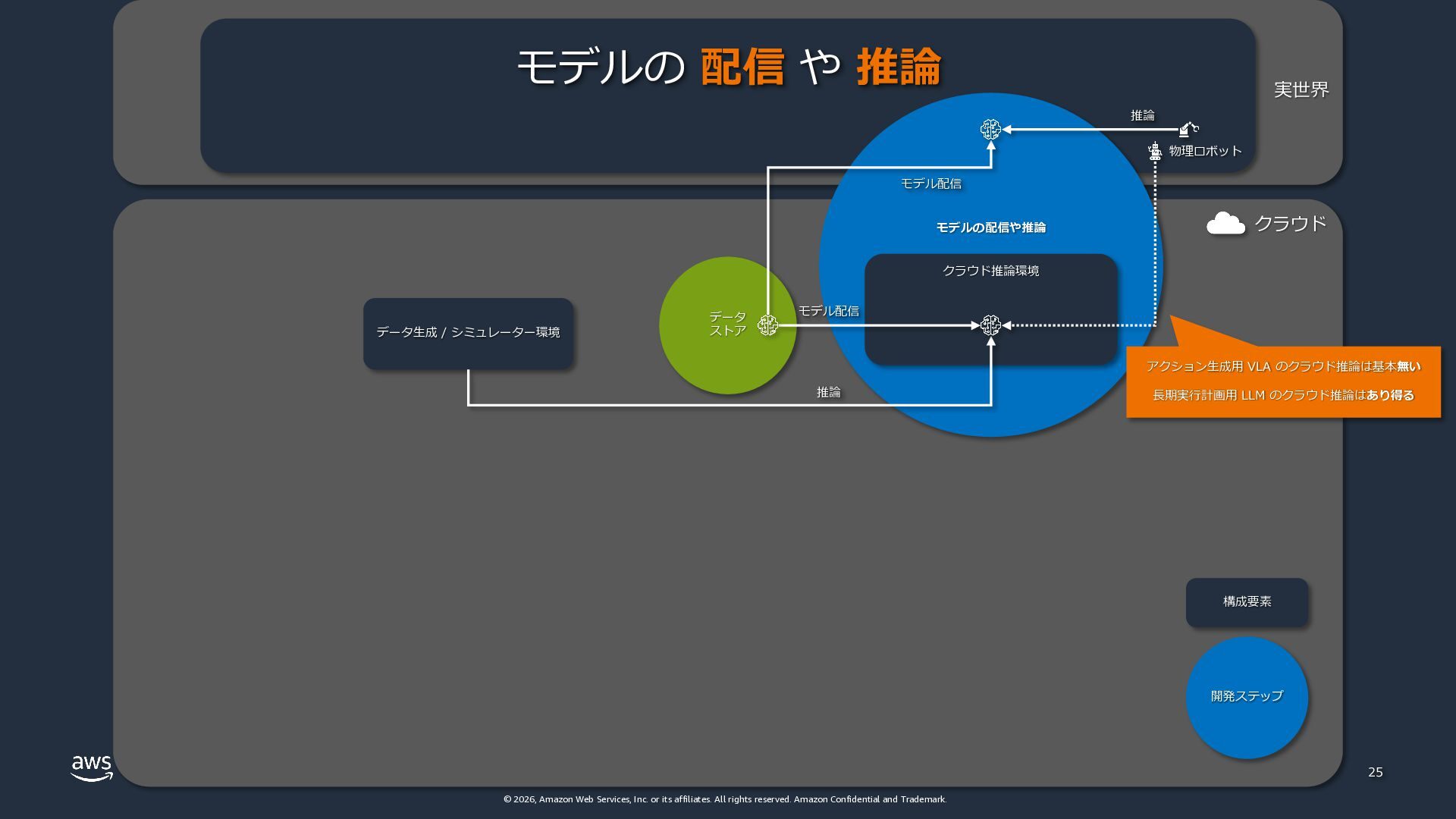 rights reserved. Amazon Confidential and Trademark. クラウド 実世界 物理ロボット モデルの配信や推論 25 データ ストア データ⽣成 / シミュレーター環境 クラウド推論環境 モデル配信 モデルの 配信 や 推論 モデル配信 推論 構成要素 開発ステップ 推論 アクション⽣成⽤ VLA のクラウド推論は基本無い ⻑期実⾏計画⽤ LLM のクラウド推論はあり得る