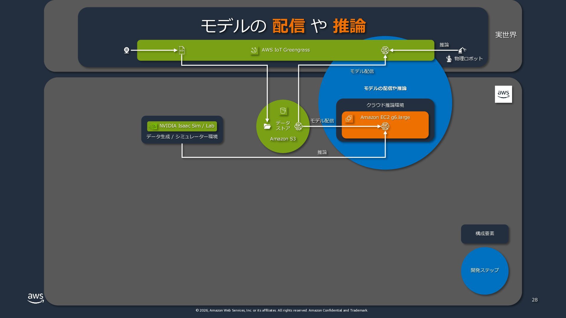 rights reserved. Amazon Confidential and Trademark. 実世界 物理ロボット モデルの配信や推論 26 データ ストア Amazon S3 AWS IoT Greengrass データ⽣成 / シミュレーター環境 クラウド推論環境 Amazon EC2 g系 インスタンス モデル配信 モデルの 配信 や 推論 NVIDIA Isaac Sim / Lab モデル配信 推論 構成要素 開発ステップ 推論