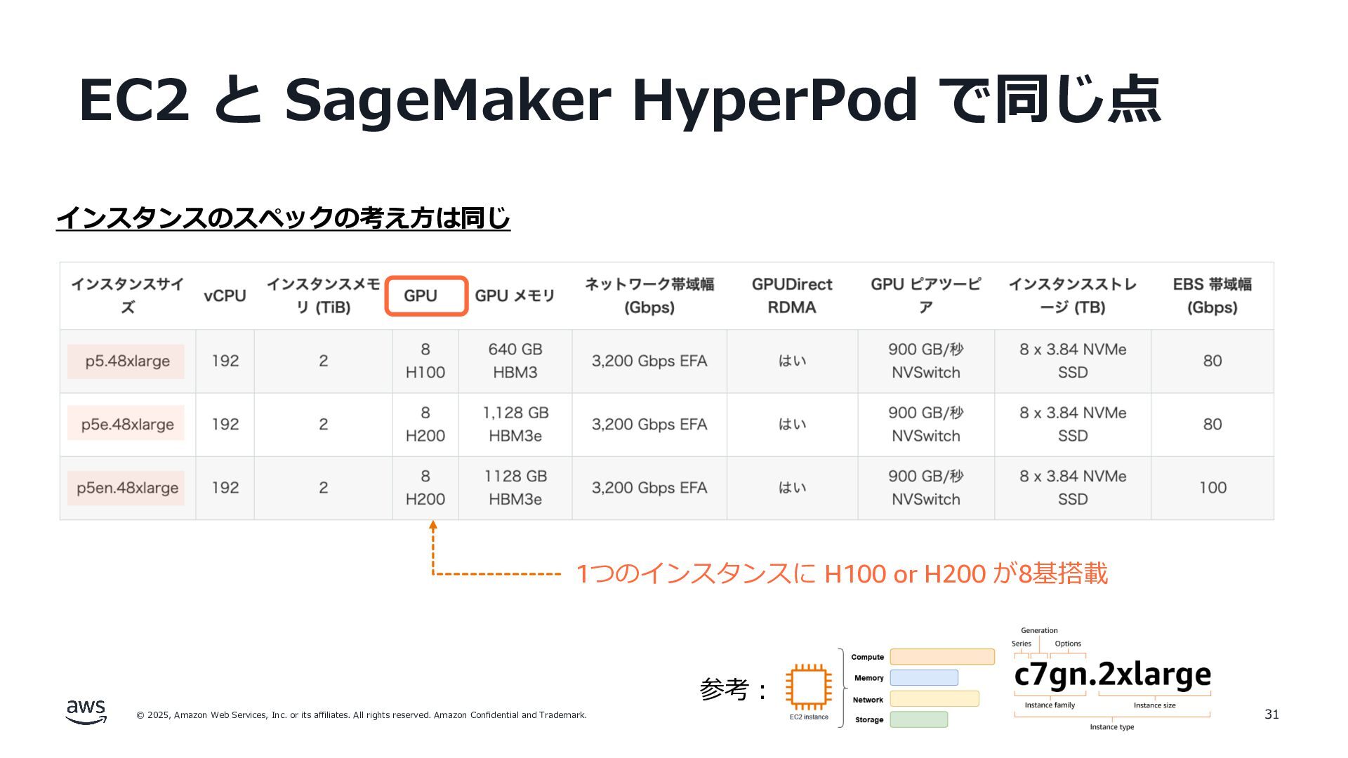 rights reserved. Amazon Confidential and Trademark. EC2 と SageMaker HyperPod で同じ点 31 参考︓ インスタンスのスペックの考え⽅は同じ 1つのインスタンスに H100 or H200 が8基搭載