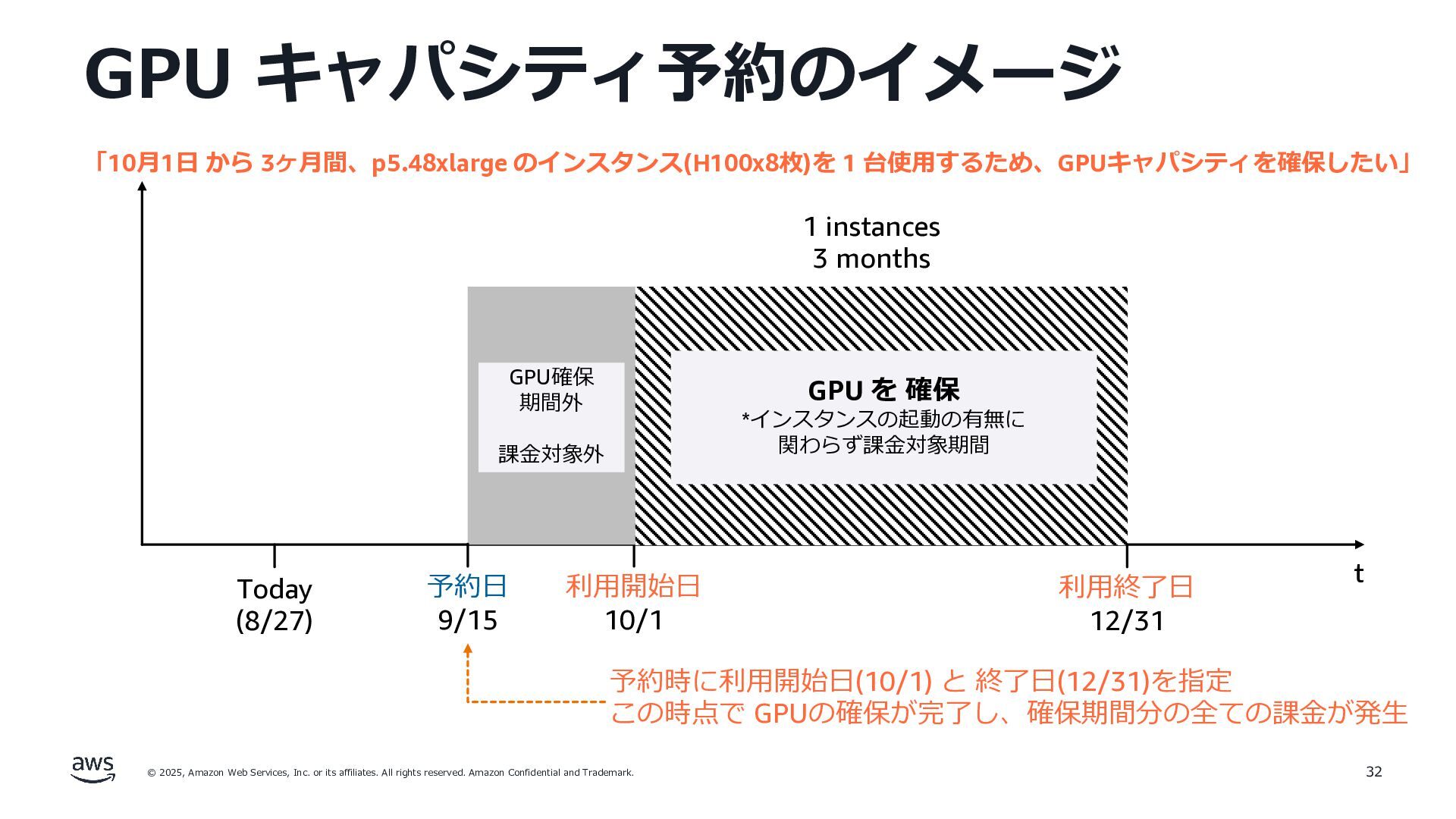 rights reserved. Amazon Confidential and Trademark. Today (8/27) 1 instances 3 months 「10⽉1⽇ から 3ヶ⽉間、p5.48xlarge のインスタンス(H100x8枚)を 1 台使⽤するため、GPUキャパシティを確保したい」 利⽤開始⽇ 10/1 利⽤終了⽇ 12/31 32 予約⽇ 9/15 GPU を 確保 *インスタンスの起動の有無に 関わらず課⾦対象期間 GPU確保 期間外 課⾦対象外 予約時に利⽤開始⽇(10/1) と 終了⽇(12/31)を指定 この時点で GPUの確保が完了し、確保期間分の全ての課⾦が発⽣ GPU キャパシティ予約のイメージ t