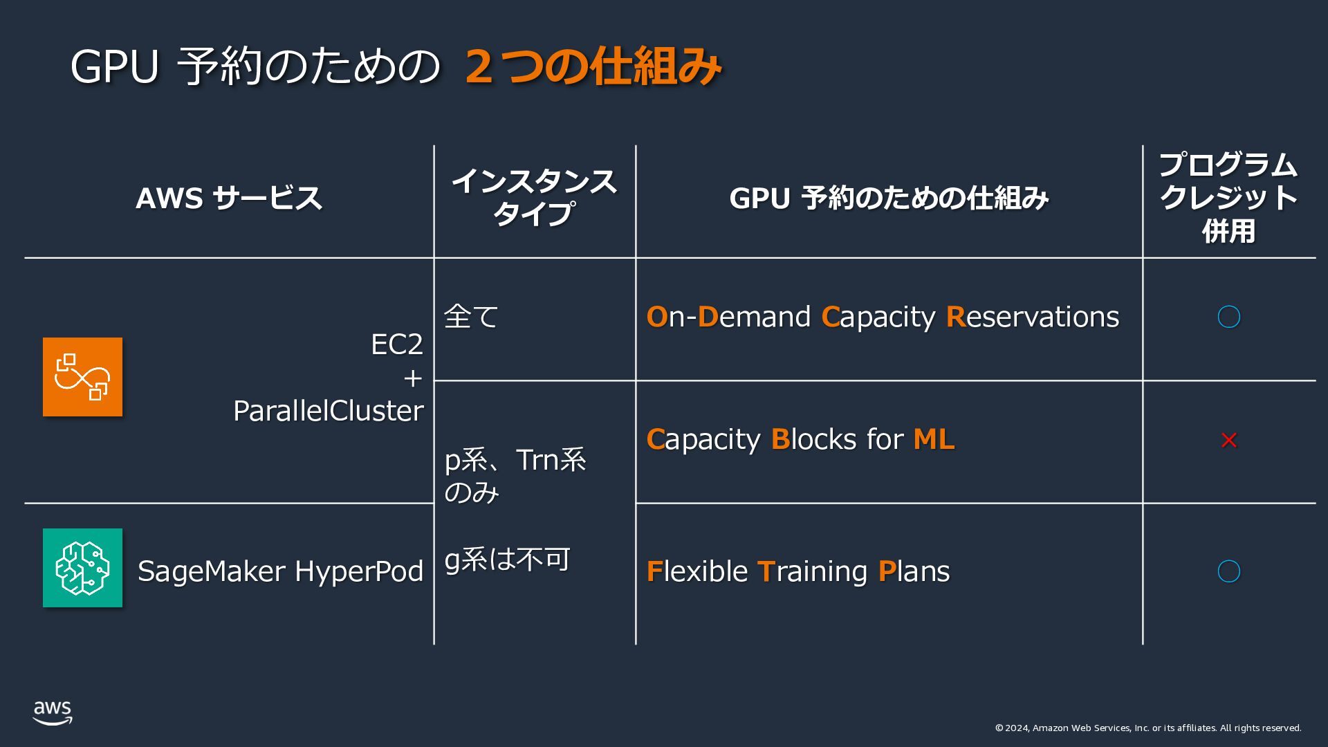 rights reserved. GPU 予約のための 2つの仕組み AWS サービス インスタンス タイプ GPU 予約のための仕組み プログラム クレジット 併⽤ EC2 + ParallelCluster 全て On-Demand Capacity Reservations ◦ p系、Trn系 のみ g系は不可 Capacity Blocks for ML × SageMaker HyperPod Flexible Training Plans ◦