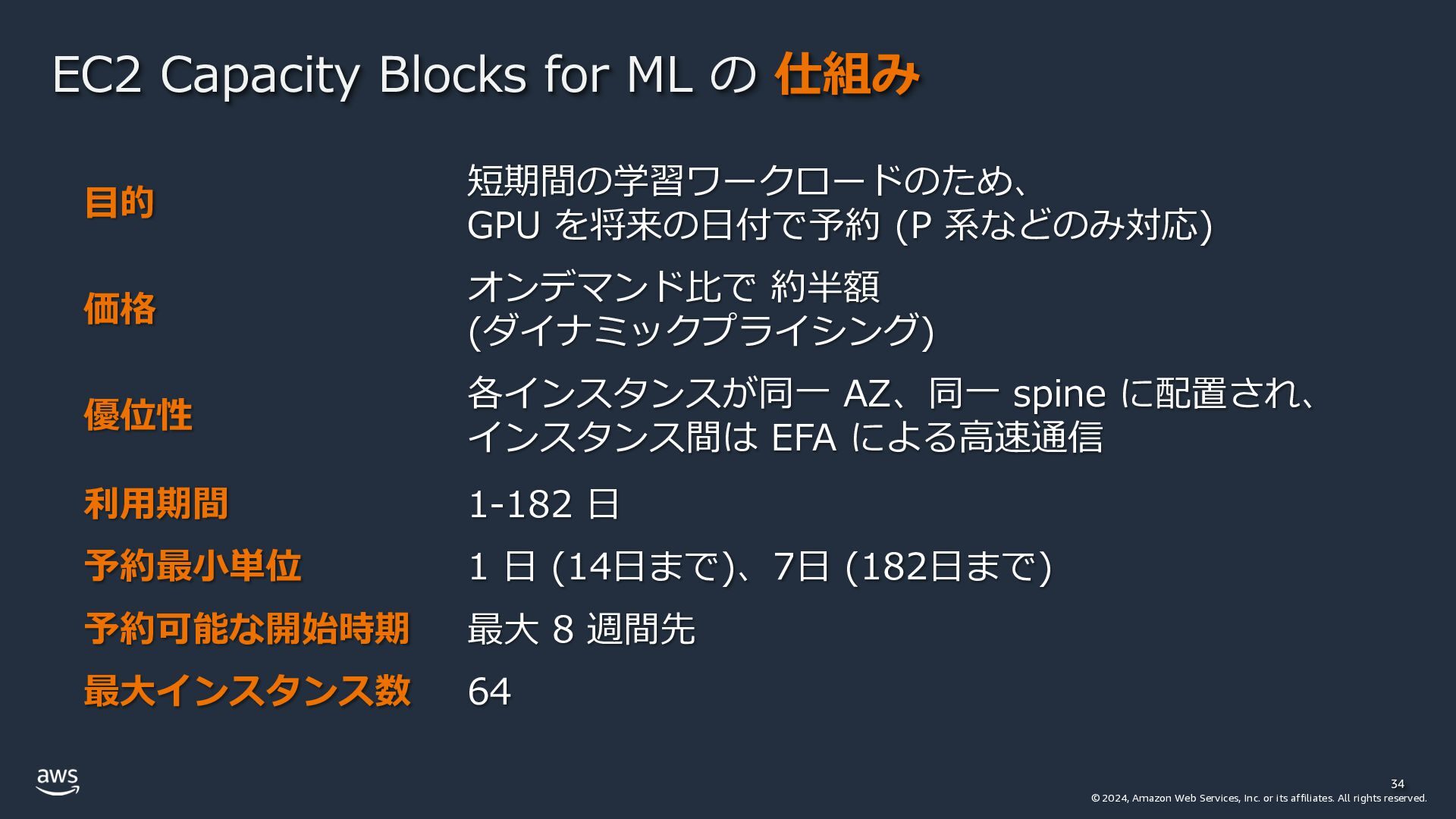 rights reserved. EC2 Capacity Blocks for ML の 仕組み 34 ⽬的 短期間の学習ワークロードのため、 GPU を将来の⽇付で予約 (P 系などのみ対応) 価格 オンデマンド⽐で 約半額 (ダイナミックプライシング) 優位性 各インスタンスが同⼀ AZ、同⼀ spine に配置され、 インスタンス間は EFA による⾼速通信 利⽤期間 1-182 ⽇ 予約最⼩単位 1 ⽇ (14⽇まで)、7⽇ (182⽇まで) 予約可能な開始時期 最⼤ 8 週間先 最⼤インスタンス数 64