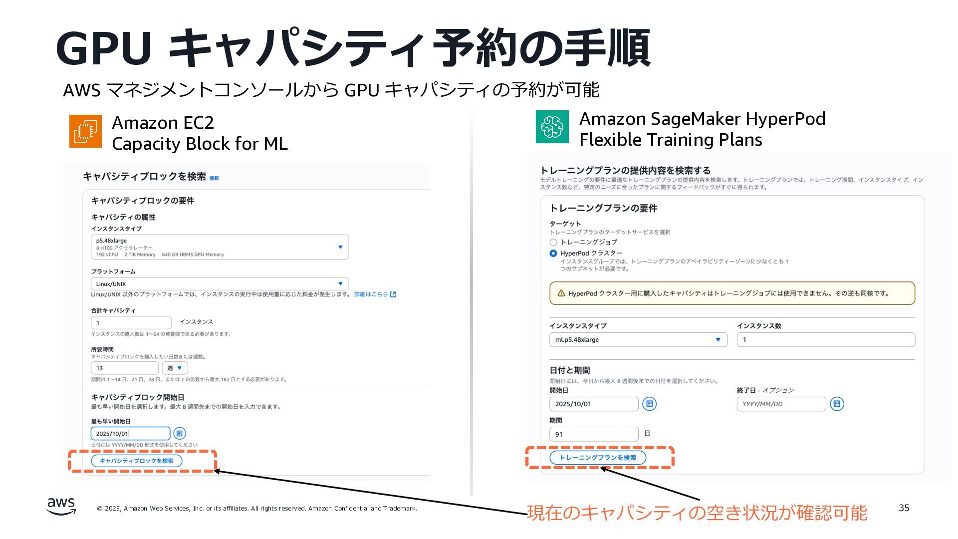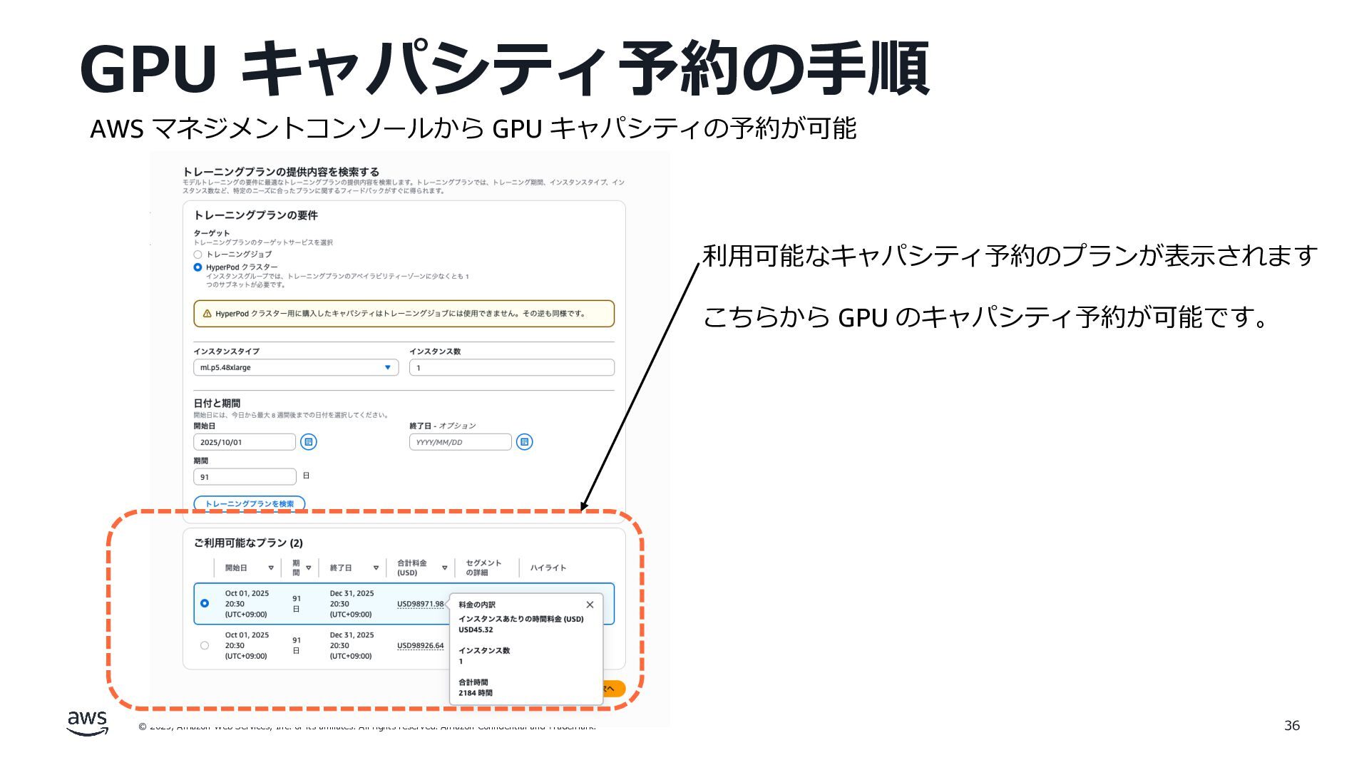 rights reserved. Amazon Confidential and Trademark. GPU キャパシティ予約の⼿順 35 AWS マネジメントコンソールから GPU キャパシティの予約が可能 Amazon EC2 Capacity Block for ML Amazon SageMaker HyperPod Flexible Training Plans 現在のキャパシティの空き状況が確認可能