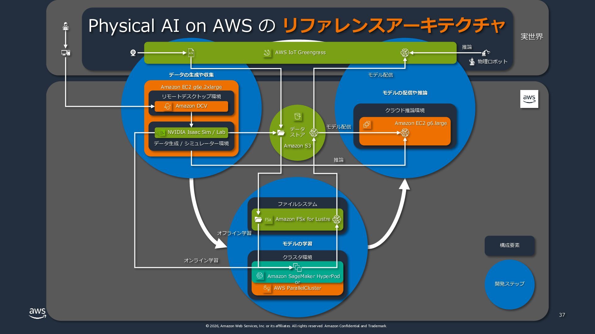 rights reserved. Amazon Confidential and Trademark. 実世界 物理ロボット データの⽣成や収集 モデルの学習 モデルの配信や推論 Amazon EC2 g6e.2xlarge ファイルシステム クラスタ環境 AWS ParallelCluster 4 データ ストア Amazon S3 Amazon FSx for Lustre Amazon SageMaker HyperPod or AWS IoT Greengrass リモートデスクトップ環境 データ⽣成 / シミュレーター環境 クラウド推論環境 Amazon EC2 g6.large モデル配信 Physical AI on AWS の リファレンスアーキテクチャ Amazon DCV NVIDIA Isaac Sim / Lab モデル配信 推論 構成要素 開発ステップ オフライン学習 オンライン学習 推論
