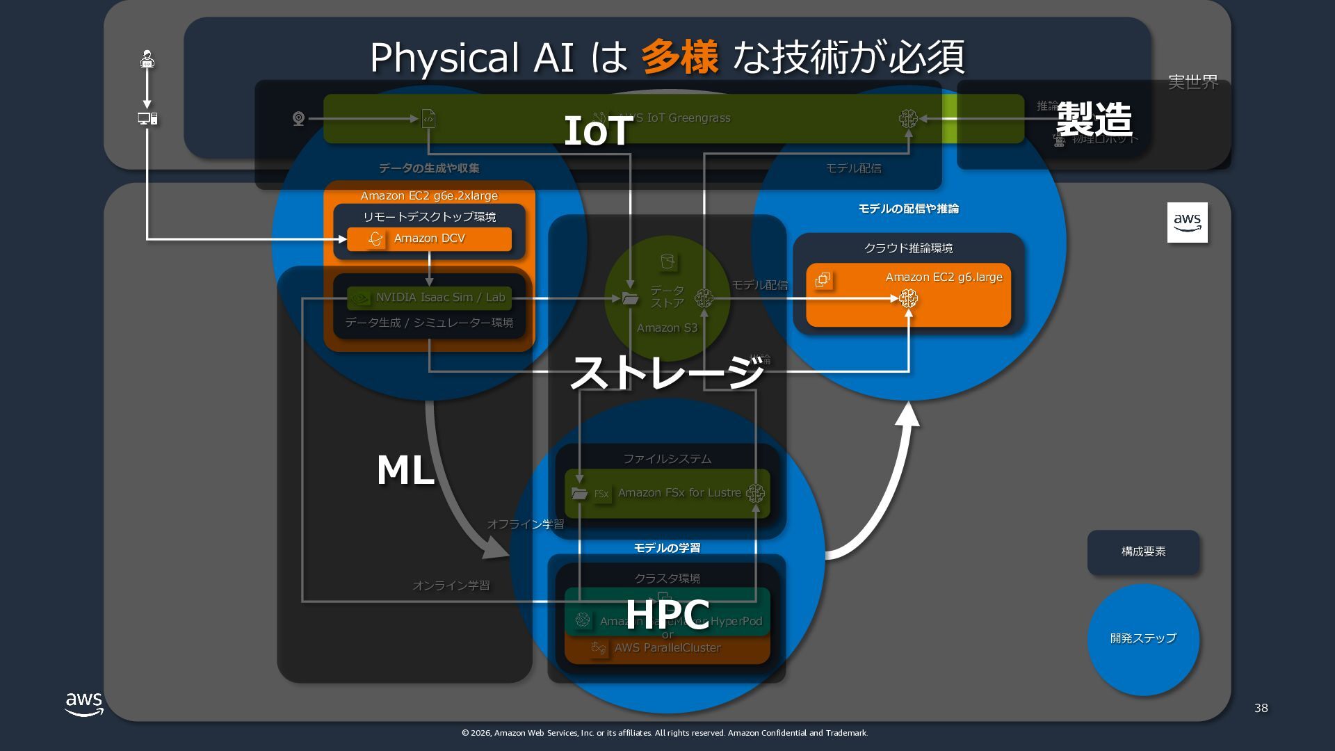 rights reserved. Amazon Confidential and Trademark. 実世界 物理ロボット データの⽣成や収集 モデルの学習 モデルの配信や推論 Amazon EC2 g6e.2xlarge ファイルシステム クラスタ環境 AWS ParallelCluster 37 データ ストア Amazon S3 Amazon FSx for Lustre Amazon SageMaker HyperPod or AWS IoT Greengrass リモートデスクトップ環境 データ⽣成 / シミュレーター環境 クラウド推論環境 Amazon EC2 g6.large モデル配信 Physical AI on AWS の リファレンスアーキテクチャ Amazon DCV NVIDIA Isaac Sim / Lab モデル配信 推論 構成要素 開発ステップ オフライン学習 オンライン学習 推論