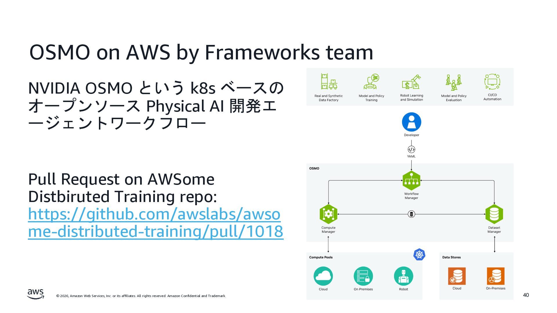 rights reserved. Amazon Confidential and Trademark. OSMO on AWS by Frameworks team NVIDIA OSMO という k8s ベースの オープンソース Physical AI 開発エ ージェントワークフロー Pull Request on AWSome Distbiruted Training repo: https://github.com/awslabs/awso me-distributed-training/pull/1018 40
