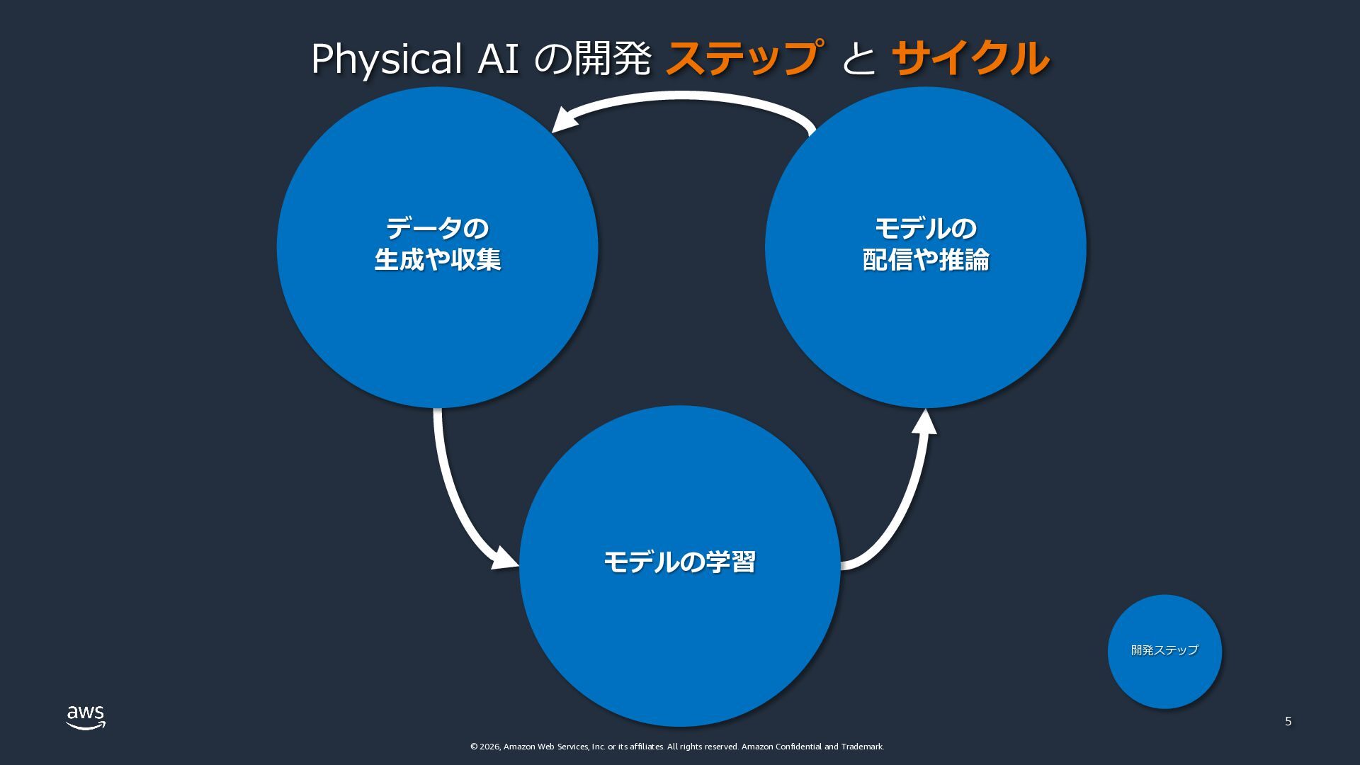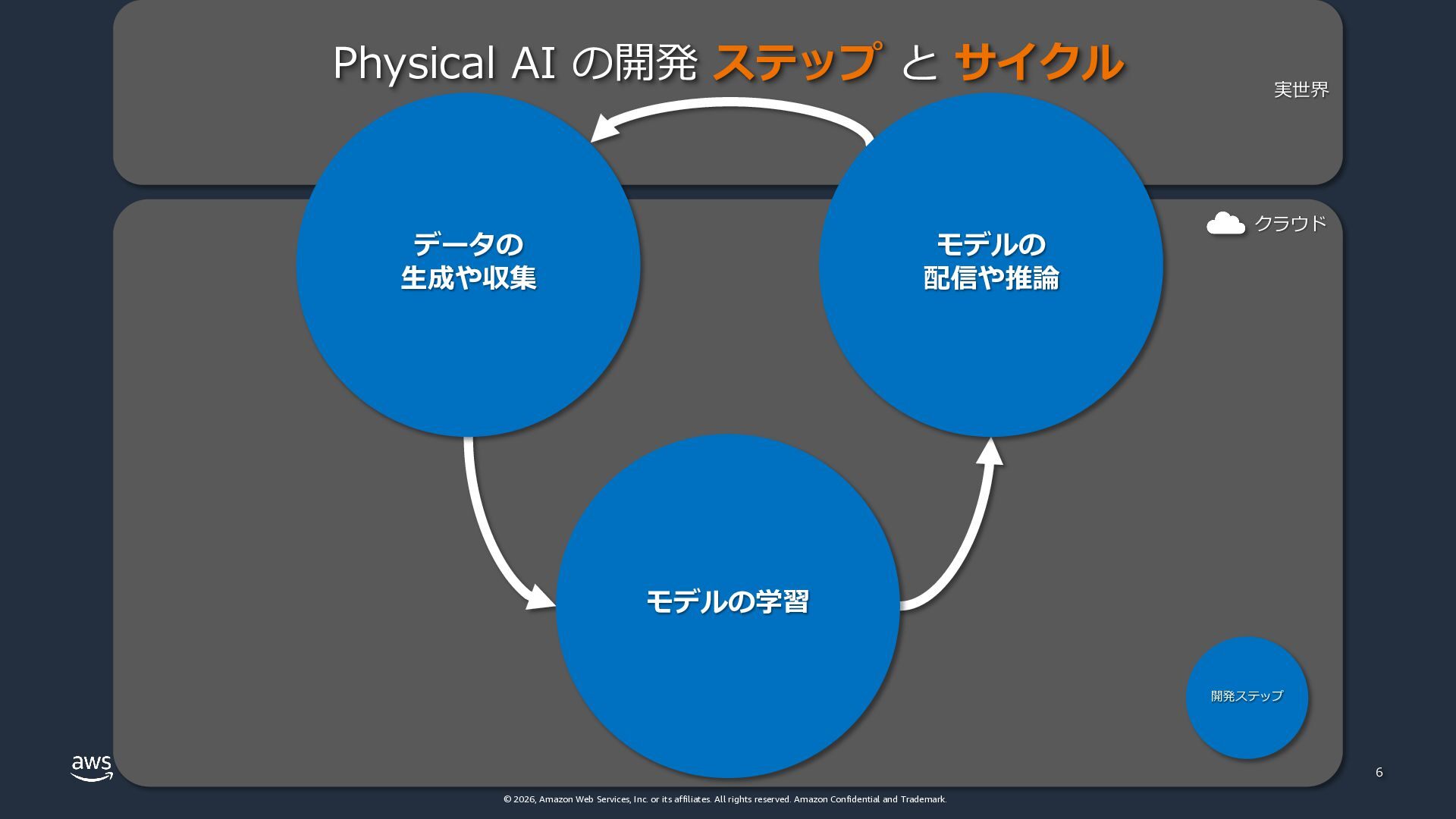 rights reserved. Amazon Confidential and Trademark. 5 モデル配信 Physical AI の開発 ステップ と サイクル データの ⽣成や収集 モデルの学習 モデルの 配信や推論 開発ステップ