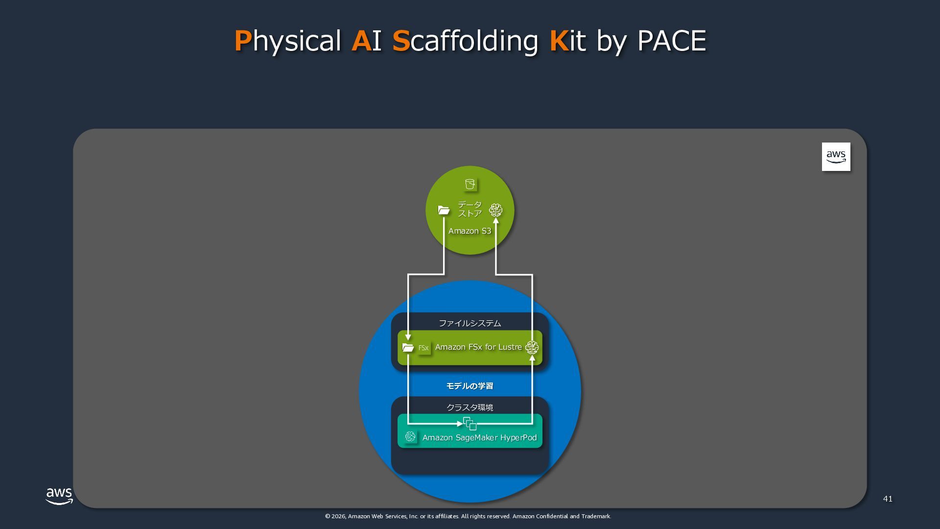 rights reserved. Amazon Confidential and Trademark. モデルの学習 ファイルシステム クラスタ環境 41 データ ストア Amazon S3 Amazon FSx for Lustre Amazon SageMaker HyperPod Physical AI Scaffolding Kit by PACE